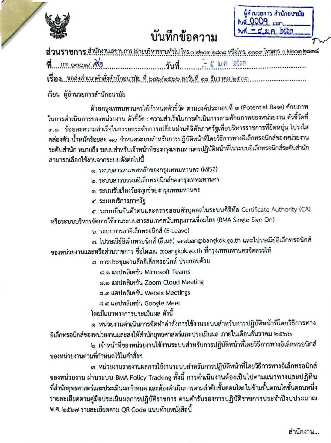 ![]() | 05-07-2024 | 0.00 | สำนักอนามัยมีการรายงานข้อมูลการใช้ระบบสำหรับการปฏิบัติหน้าที่โดยวิธีทางอิเล็กทรอนิกส์ทั้ง 7 ระบบ เดือนมิถุนายน 2567 ได้ผ่านเกณฑ์ 4 ระบบ ดังนี้ 1. ระบบสารสนเทศหลักของกรุงเทพมหานคร (MIS2) มีบัญชีผู้ใช้งานทั้งหมด จำนวน 554 บัญชี บัญชีผู้ที่ใช้งาน (Active) จำนวน 554 บัญชี (ข้อมูลจากระบบ Data warehouse ณ วันที่ 5 กรกฎาคม 2567) 2. ระบบสารบรรณอิเล็กทรอนิกส์ของกรุงเทพมหานคร 1) ระบบงานสารบรรณอิเล็กทรอนิกส์ e -saraban.bangkok.go.th - สำนักอนามัยมีจำนวนข้าราชการเข้าระบบงานไม่น้อยกว่า ร้อยละ 70 แล้ว - หน่วยสารบรรณกลางของสำนักอนามัยมีการลงทะเบียนรับหนังสือที่รับเข้ามาจากภายนอกกรุงเทพมหานคร เสนอผู้บังคับบัญชาเกษียนหนังสือ และหรือส่งหนังสือให้ส่วนราชการหรือผู้ที่เกี่ยวข้องดำเนินการผ่านระบบได้ - ทุกส่วนราชการในหน่วยงานอยู่ระหว่างดำเนินการสร้างหนังสือ เสนอหนังสือ ลงนามหนังสือ และส่งหนังสือเพื่อติดต่อภายในหน่วยงานเดียวกันผ่านระบบฯ - ทุกส่วนราชการในสังกัดสำนักอนามัยอยู่ระหว่างดำเนินการสร้างหนังสือ เสนอหนังสือ ลงนามในหนังสือ และส่งหนังสือเพื่อติดต่อระหว่างหัวหน้าหน่วยงานกับหัวหน้าส่วนราชการในสังกัดสำนักปลัดกรุงเทพมหานคร และหรือผู้บริหารกรุงเทพมหานคร ผ่านระบบฯ 2) ระบบหนังสือเวียนอิเล็กทรอนิกส์ e -saraban.bangkok.go.th - หน่วยงานสารบรรณกลางของหน่วยงานมีการเข้าใช้งานระบบหนังสือเวียนอิเล็กทรอนิกส์ และนำเข้าหนังสือเวียนที่เกี่ยวข้องแล้วลงทะเบียนรับหนังสือผ่านระบบงานสารบรรณอิเล็กทรอนิกส์หรือสามารถสร้างหนังสือเวียนในระบบงานสารบรรณอิเล็กทรอนิกส์ พร้อมเวียนแจ้งผ่านระบบหนังสือเวียนอิเล็กทรอนิกส์ได้ 3) ระบบบริหารจัดการห้องประชุม e-meeting.bangkok.go.th - ทุกส่วนราชการในสังกัดสำนักอนามัย ส่งรายชื่อข้าราชการพร้อม log in เข้าระบบบริหารจัดการห้องประชุมครบทุกส่วนราชการ (ทั้งนี้ สยป. ได้เปิดสิทธิ์ให้ผู้ใช้งานระบบฯทุกคน สามารถใช้ระบบบริหารจัดการห้องประชุมได้อัตโนมัติ) 3. ระบบรับเรื่องร้องทุกข์ของกรุงเทพมหานคร มีการ (log in) เข้าระบบทราฟฟี่ฟองดูว์ (Traffy Fondfue) อย่างน้อยวันละ 2 ครั้ง รอบเช้า 1 ครั้ง และรอบบ่าย 1 ครั้ง มีเจ้าหน้าที่ดูแลระบบคือ นายสมชาย อุทัยนาง และนายณัฐพล พลโยราช 4. ระบบยืนยันตัวตนและตรวจสอบตัวบุคคลในระบบดิจิทัล Certificate Authority (CA) หรือระบบบริหารจัดการการใช้งานระบบสารสนเทศสนับสนุนการเชื่อมโยง (BMA Single Sign-On) ระบบบริหารจัดการการใช้งานระบบสารสนเทศสนับสนุนการเชื่อมโยง (BMA Single Sign- On) มีจำนวนข้าราชการเข้าใช้งานระบบฯ (sso) จำนวน 2,282 คน บุคลากรเข้าใช้งานระบบฯ (sso) จำนวน 480 คน รวมเป็น 2,762 คน ส่วนระบบยืนยัน