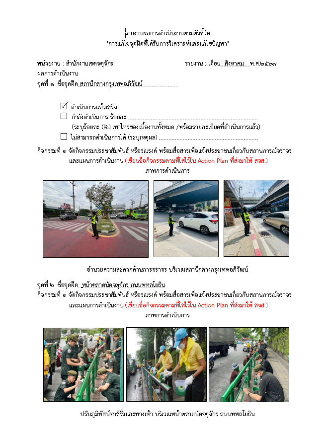 30-08-20246.00สำนักการจราจร ได้กำหนดจุดฝืดในพื้นที่เขตจตุจักร จำนวน 6 จุด (ตามบัญชีของ สจส.) ดังนี้ 1. สถานีกลางกรุงเทพอภิวัฒน์ 2. หน้าตลาดนัดจตุจักร ถนนพหลโยธิน 3. หน้าตลาดต้นไม้ ถนนกำแพงเพชร 4. ปากทางลาดพร้าว (ช่วงโค้ง ถนนลาดพร้าวก่อนตัดกับ ถนนพหลโยธิน) 5. ถนนลาดพร้าว (ปากซอยลาดพร้าว 23 - ซอยลาดพร้าว 25) 6. ถนนงามวงศ์วานก่อนถึงแยกบางเขน 100 เมตร (มาจากแยกพงษ์เพชร) ดำเนินการแล้ว