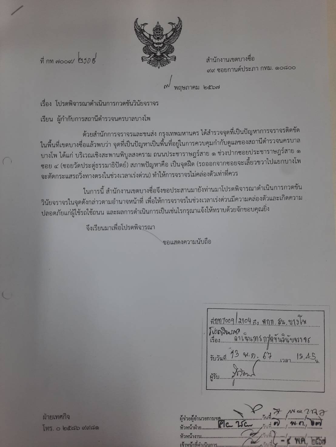 ![]() | 22-06-2024 | 2.00 | ![]() | ประสาน สน.ประชาชื่น และ สน.บางโพ ดำเนินการกวดขันวินัยจราจร | |