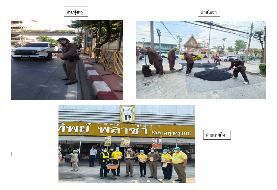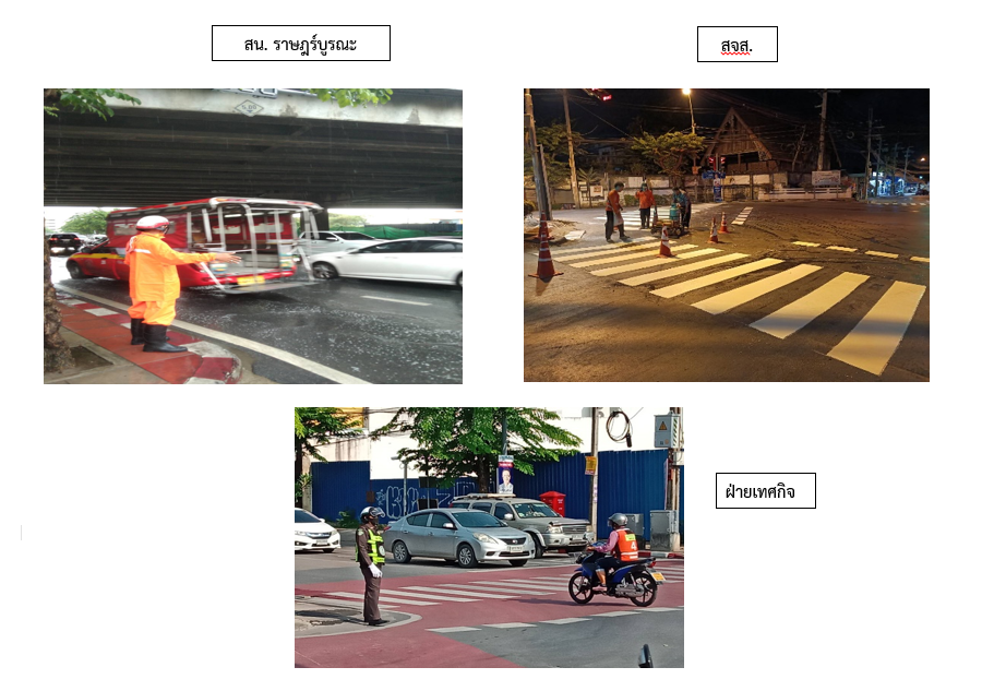 ![]() | 19-04-2024 | 1.00 | ![]() | แยกไฟแดงทุ่งครุ 1. เทศกิจ = ประชาสัมพันธ์ หรือรณรงค์ พร้อมสื่อสารเพื่อแจ้งประชาชนเกี่ยวกับสถานการณ์จราจร และแผนการดำเนินงาน กวดขันวินัยจราจรบนทางเท้า 2. ตำรวจ = ประสาน สถานีตำรวจนครบาลราษฎร์บูรณะอำนวยความสะดวกด้านการจราจร 3. ฝ่ายโยธา = แก้ไขปรับปรุงเชิงกายภาพ (ในส่วนที่สามารถดำเนินการได้) / ประสานหน่วยงานที่เกี่ยวข้องเพื่อ ดำเนินการแก้ไขปรับปรุงเชิงกายภาพ | |