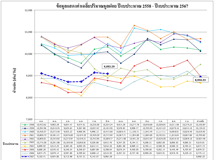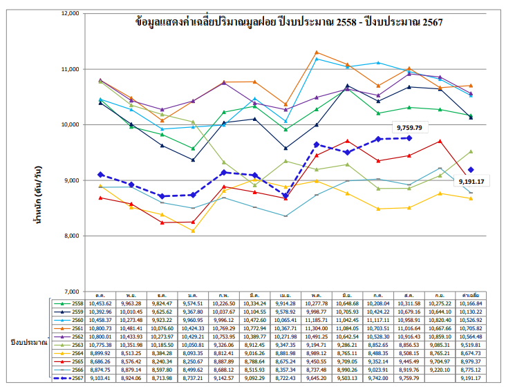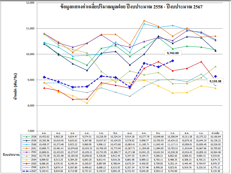 ![]() | 31-08-2024 | 0.00 | ปริมาณมูลฝอย ต.ค. 66- ก.ค. 67 รวมปริมาณขยะ 9,133.38 ตัน/วัน ปริมาณขยะเพิ่มขึ้นจากปี 65 = 154.01 ตัน/วัน คิดเป็นร้อยละ 1.72 ปริมาณขยะเพิ่มขึ้นจากปี 66 = 358.26 ตัน/วัน คิดเป็นร้อยละ 4.08 | ||