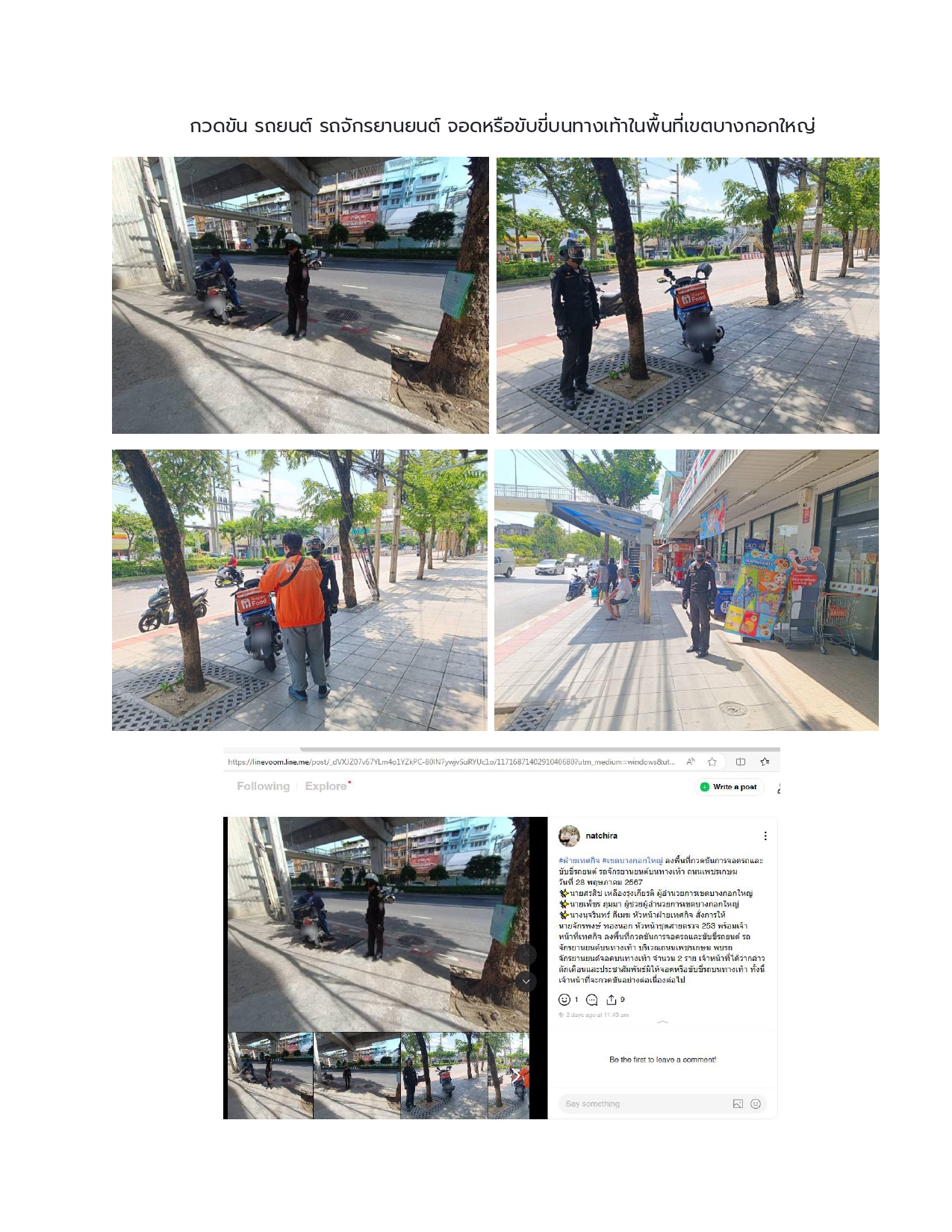 26-07-20243.00 ผลการดำเนินการตั้งแต่ วันที่ 24 มิ.ย. - 23 ก.ค. 2567 ดังนี้ กวดขันรถจอดหรือขับขี่บนทางเท้าในพื้นที่ พบผู้กระทำความผิดทั้งสิ้น 3 ราย ได้ว่ากล่าวตักเตือน จำนวน 3 ราย ดำเนินการแล้วเสร็จครบถ้วนตามเป้าหมาย