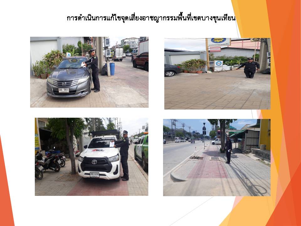 03-04-202422.001. ประชาสัมพันธ์ให้ประชาชนได้รับทราบข้อกฎหมายเกี่ยวกับการขับขี่หรือจอดรถบนทางเท้า 2. จัดเจ้าหน้าที่เทศกิจกวดขันผู้ขับขี่รถจักรยานยนต์บนทางเท้า บริเวณ ถนนบางกระดี่ ถนนท่าข้าม ถนนแสมดำ และถนนบางขุนเทียน-ชายทะเล