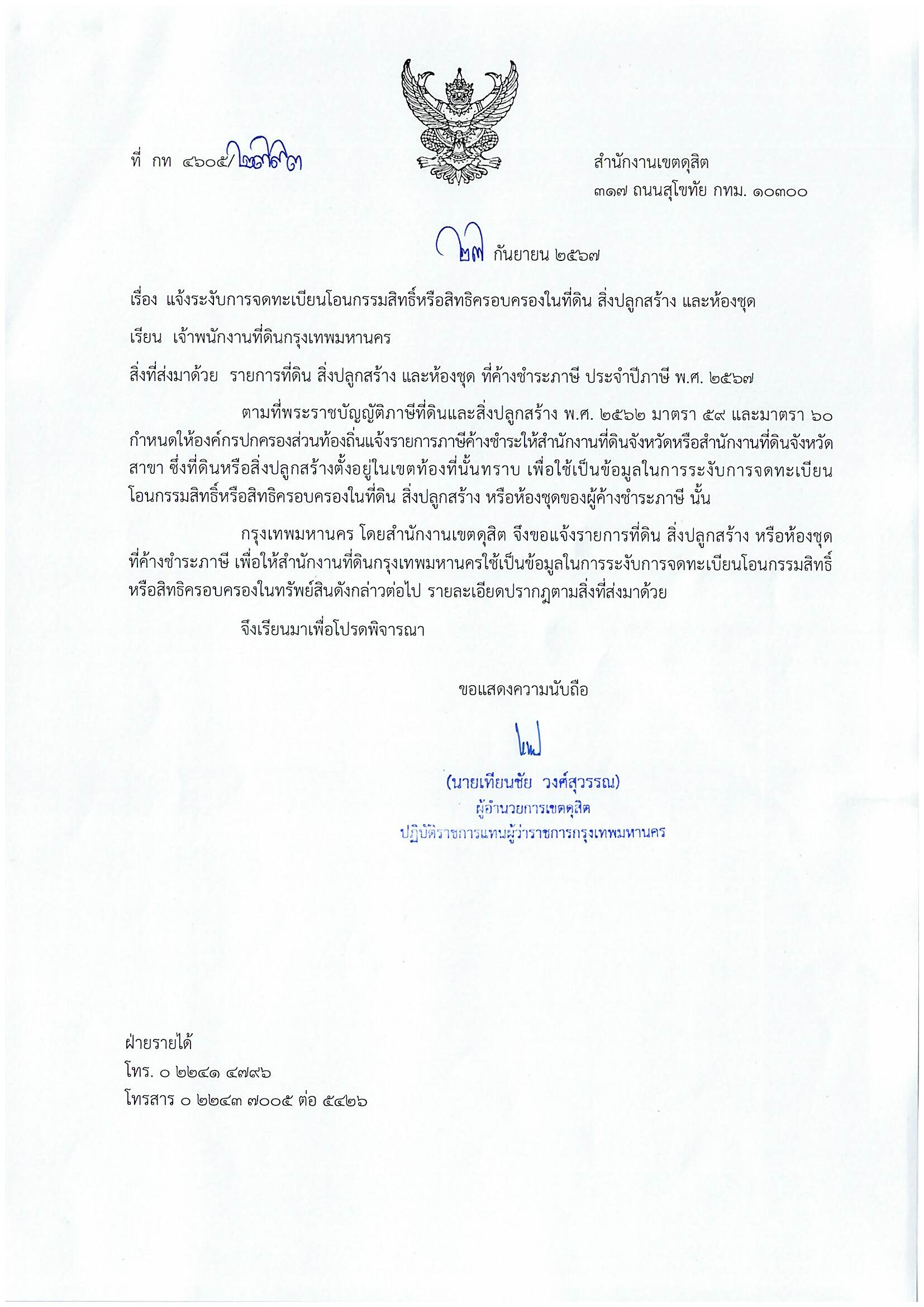 1การสำรวจภาษีที่ดินและสิ่งปลูกสร้างประจำปีภาษี พ.ศ.2567 10.0017-07-202330-11-2023