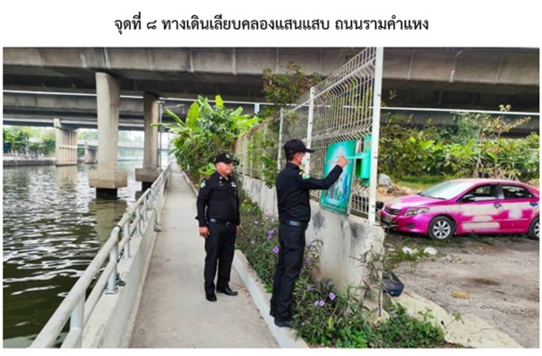 | 04-03-2024 | 0.00 |  | จุดที่ 8 ทางเดินเลียบคลองแสนแสบ ถนนรามคำแหง ลักษณะของความเสี่ยง เปลี่ยวไม่มีคนสัญจรผ่าน เงื่อนไขที่ต้องทำเนินการแก้ไข ติดตั้งซ่อมแซมไฟฟ้าส่องสว่าง (ดำเนินการแล้ว) ติดตั้งซ่อมแซมกล้อง CCTV ตัดต้นไม้ | |