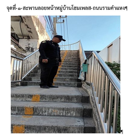 | 04-03-2024 | 1.00 |  | จุดที่ 1 สะพานลอยหน้าหมู่บ้านโฮมเพลส ถนนรามคำแหง ลักษณะความเสี่ยง เป็นสะพานลอย มีคนสัญจรแต่เปลี่ยว เงื่อนไขที่ต้องดำเนินการแก้ไขตรวจ คือ ดำเนินการเฝ้าระวังและตรวจตราพื้นที่เสี่ยง อย่างน้อย 1 ครั้ง/วัน | |