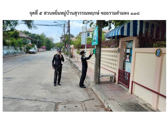 | 04-03-2024 | 1.00 |  | จุดที่ 5 สวนหยิ่มหมู่บ้านสุวรรณพฤกษ์ ซอยรามคำแหง 118 ลักษณะของความเสี่ยง เปลี่ยวไม่มีคนสัญจรผ่าน เงื่อนไขที่ต้องดำเนินการแก้ไขทำความสะอาดพื้นที่ และจัดเจ้าหน้าที่เทศกิจดำเนินการเฝ้าระวังตรวจตราความปลอดภัย อย่างน้อย 1 ครั้ง/วัน | |