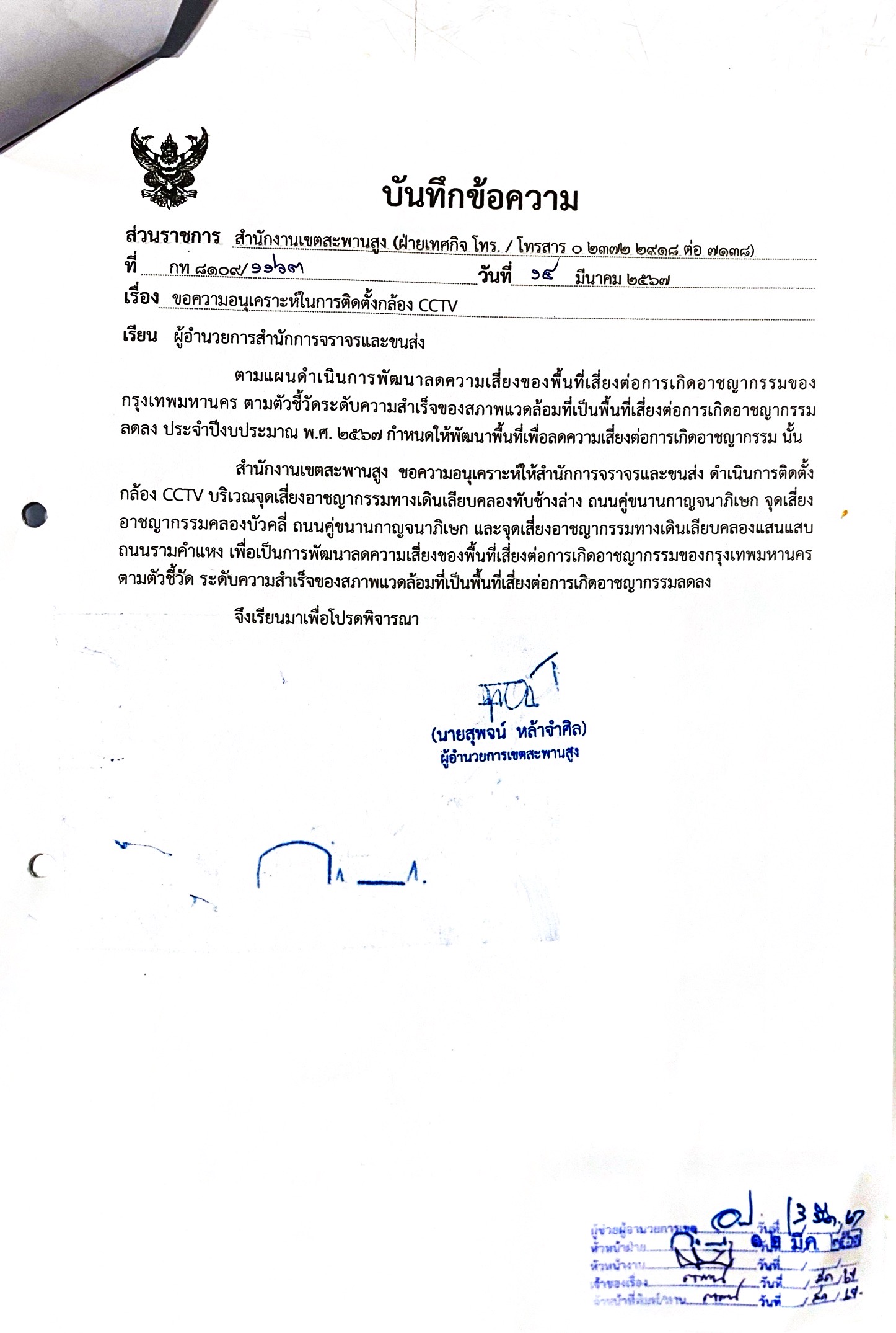 | 20-09-2024 | 2.00 |  | สำนักงานเขตสะพานสูง จัดทำหนังสือถึงสำนักการจราจรและขนส่ง ให้ดำเนินการติดตั้งกล้อง CCTV บริเวณจุดเสี่ยงอาชญากรรมคลองบัวคลี่ ถนนคู่ขนานกาญจนาภิเษก /ทางเดินเลียบคลองทับช้างล่าง ถนนคู่ขนานกาญจนาภิเษก และทางเดินเลียบคลองแสนแสบ ถนนรามคำแหง | |