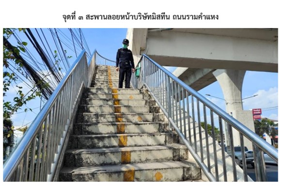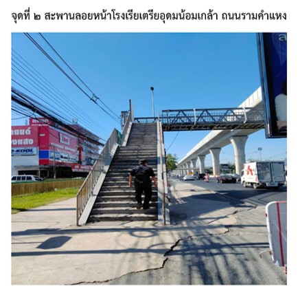| 04-03-2024 | 1.00 |  | จุดที่ 2 สะพานลอยหน้าโรงเรียเตรียอุดมน้อมเกล้า ถนนรามคำแหง ลักษณะของความเสี่ยง เป็นสะพานลอย มีคนสัญจรแต่เปลี่ยว เงื่อนไขที่ต้องทดำเนินการแก้ไข จัดเจ้าหน้าที่เทศกิจดำเนินการเฝ้าระวังตรวจตราความปลอดภัย อย่างน้อย 1 ครั้ง/วัน | |