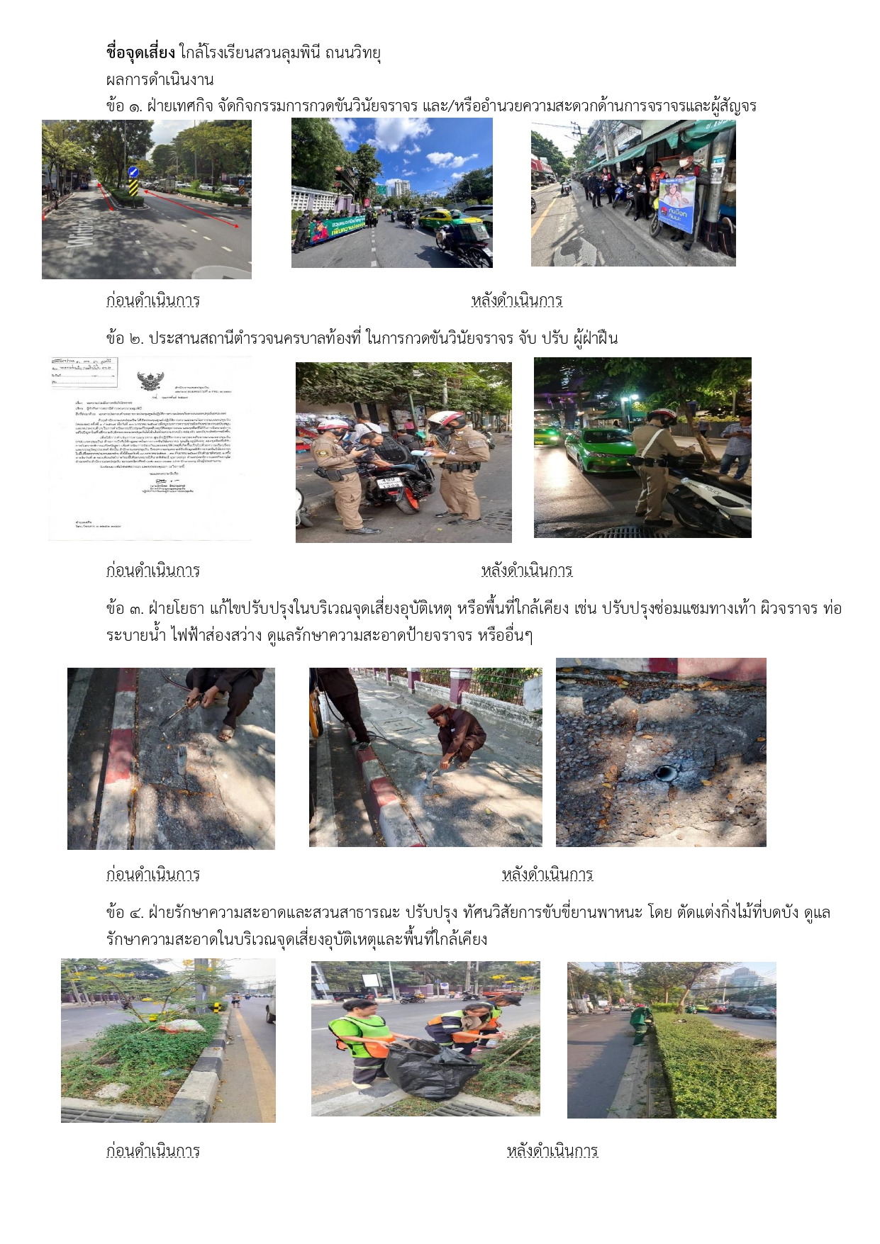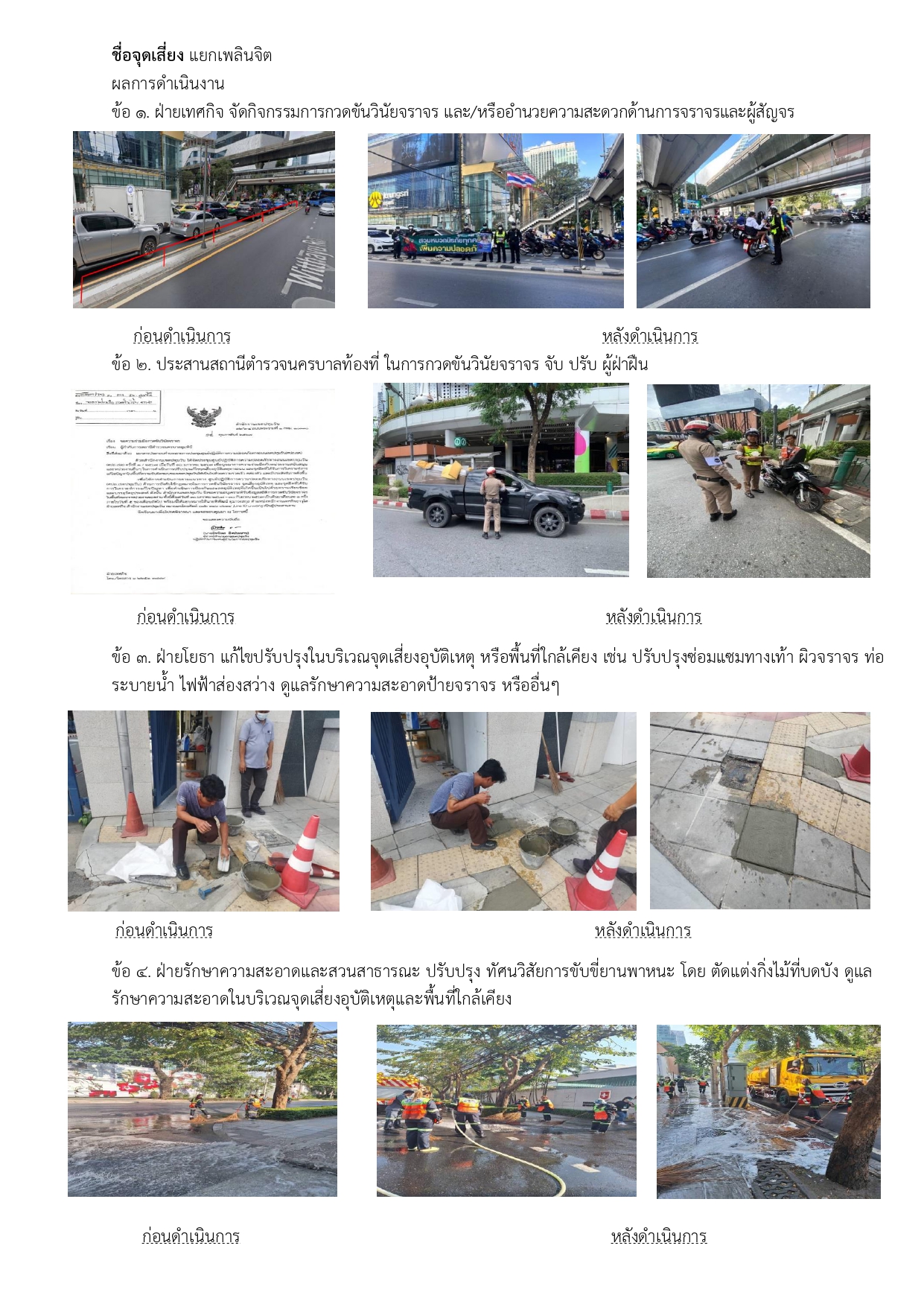 ![]() | 24-04-2024 | 1.00 | ![]() | ชื่อจุดเสี่ยง แยกเพลินจิต 1. ฝ่ายเทศกิจ จัดกิจกรรมการกวดขันวินัยจราจร และ/หรืออำนวยความสะดวกด้านการจราจรและผู้สัญจร 2. ประสานสถานีตำรวจนครบาลท้องที่ ในการกวดขันวินัยจราจร จับ ปรับ ผู้ฝ่าฝืน 3. ฝ่ายโยธา แก้ไขปรับปรุงในบริเวณจุดเสี่ยงอุบัติเหตุ หรือพื้นที่ใกล้เคียง เช่น ปรับปรุงซ่อมแซมทางเท้า ผิวจราจร ท่อระบายน้ำ ไฟฟ้าส่องสว่าง ดูแลรักษาความสะอาดป้ายจราจร หรืออื่นๆ 4. ฝ่ายรักษาความสะอาดและสวนสาธารณะ ปรับปรุง ทัศนวิสัยการขับขี่ยานพาหนะ โดย ตัดแต่งกิ่งไม้ที่บดบัง ดูแลรักษาความสะอาดในบริเวณจุดเสี่ยงอุบัติเหตุและพื้นที่ใกล้เคียง | |