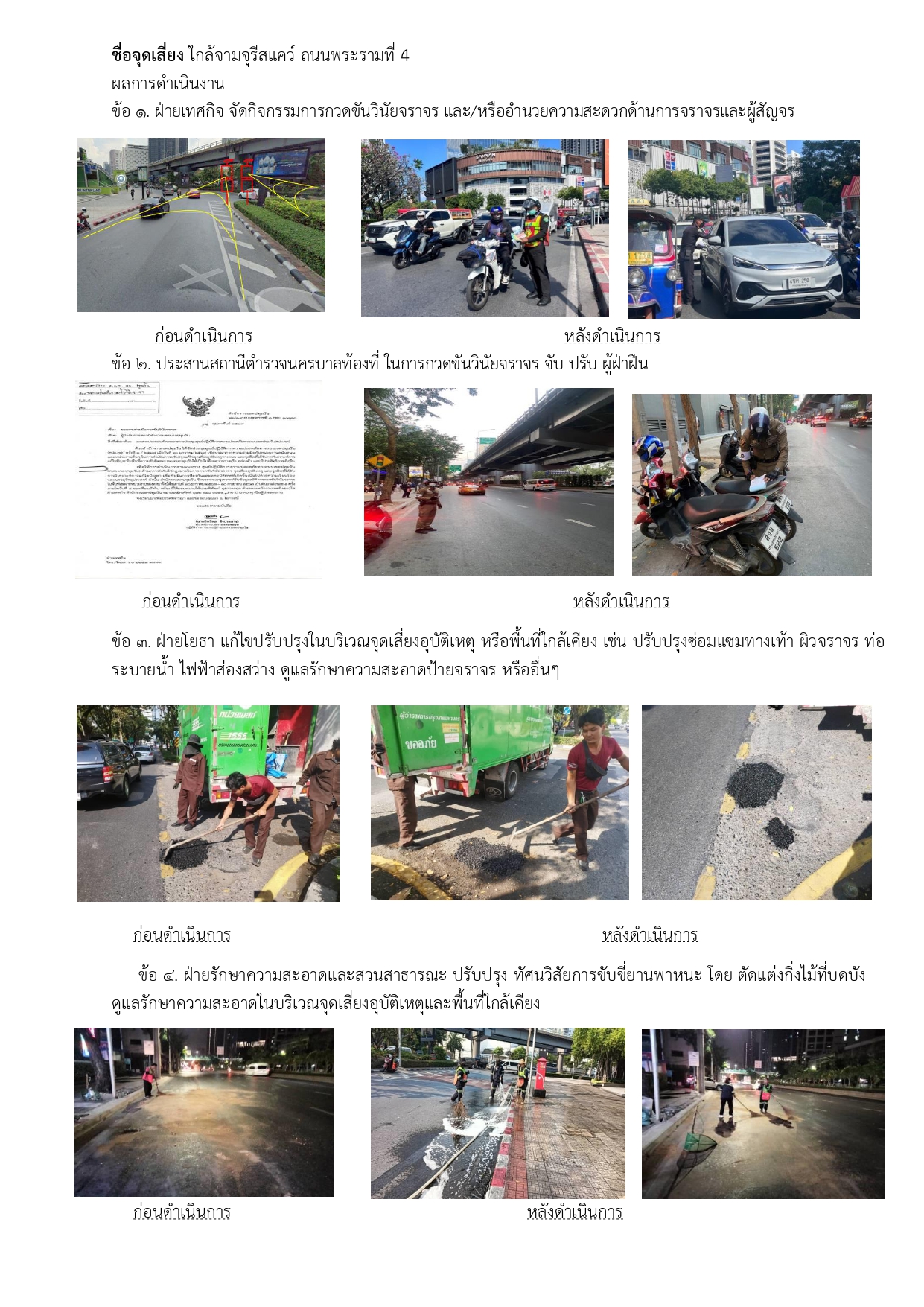 ![]() | 14-03-2024 | 1.00 | ![]() | จุดเสี่ยง ใกล้จามจุรีสแคว์ ถนนพระรามที่ 4 1. ฝ่ายเทศกิจ จัดกิจกรรมการกวดขันวินัยจราจร และ/หรืออำนวยความสะดวกด้านการจราจรและผู้สัญจร 2. ประสานสถานีตำรวจนครบาลท้องที่ ในการกวดขันวินัยจราจร จับ ปรับ ผู้ฝ่าฝืน 3. ฝ่ายโยธา แก้ไขปรับปรุงในบริเวณจุดเสี่ยงอุบัติเหตุ หรือพื้นที่ใกล้เคียง เช่น ปรับปรุงซ่อมแซมทางเท้า ผิวจราจร ท่อระบายน้ำ ไฟฟ้าส่องสว่าง ดูแลรักษาความสะอาดป้ายจราจร หรืออื่นๆ 4. ฝ่ายรักษาความสะอาดและสวนสาธารณะ ปรับปรุง ทัศนวิสัยการขับขี่ยานพาหนะ โดย ตัดแต่งกิ่งไม้ที่บดบัง ดูแลรักษาความสะอาดในบริเวณจุดเสี่ยงอุบัติเหตุและพื้นที่ใกล้เคียง |