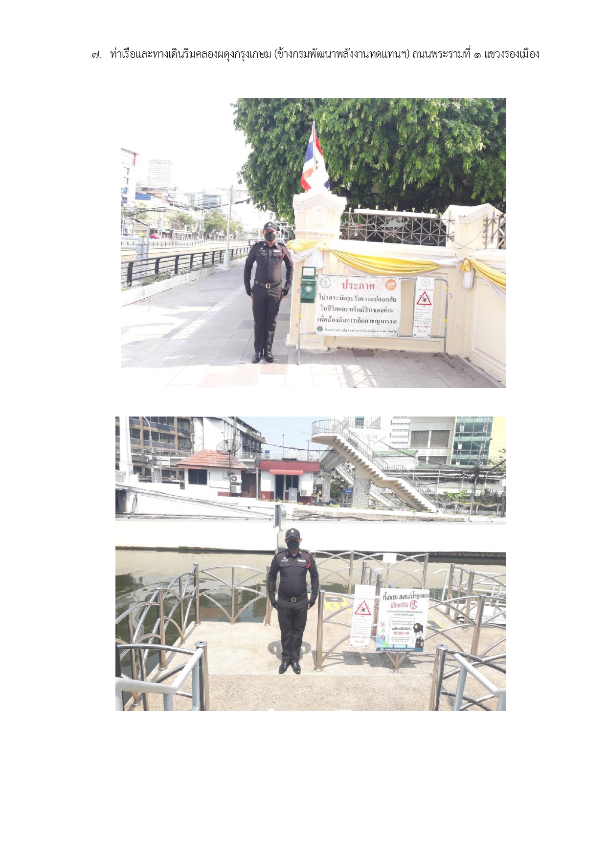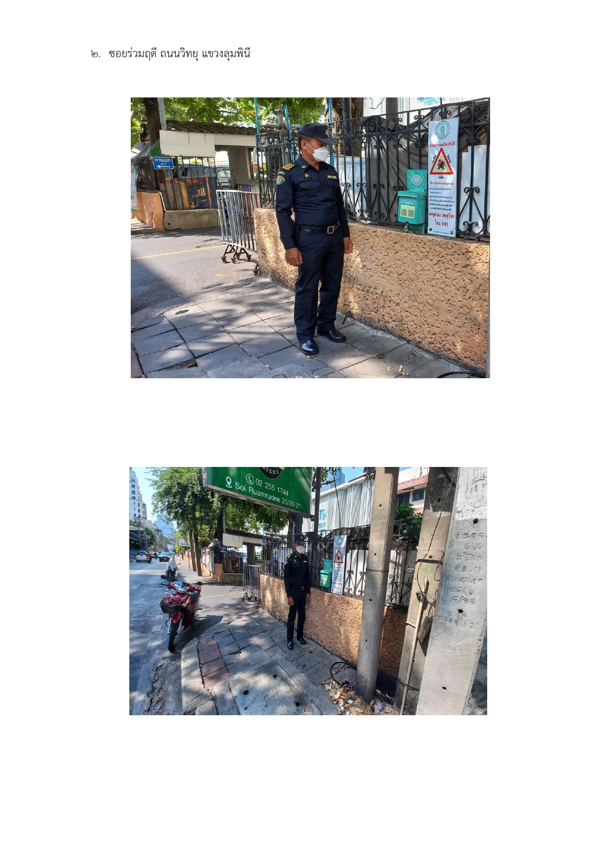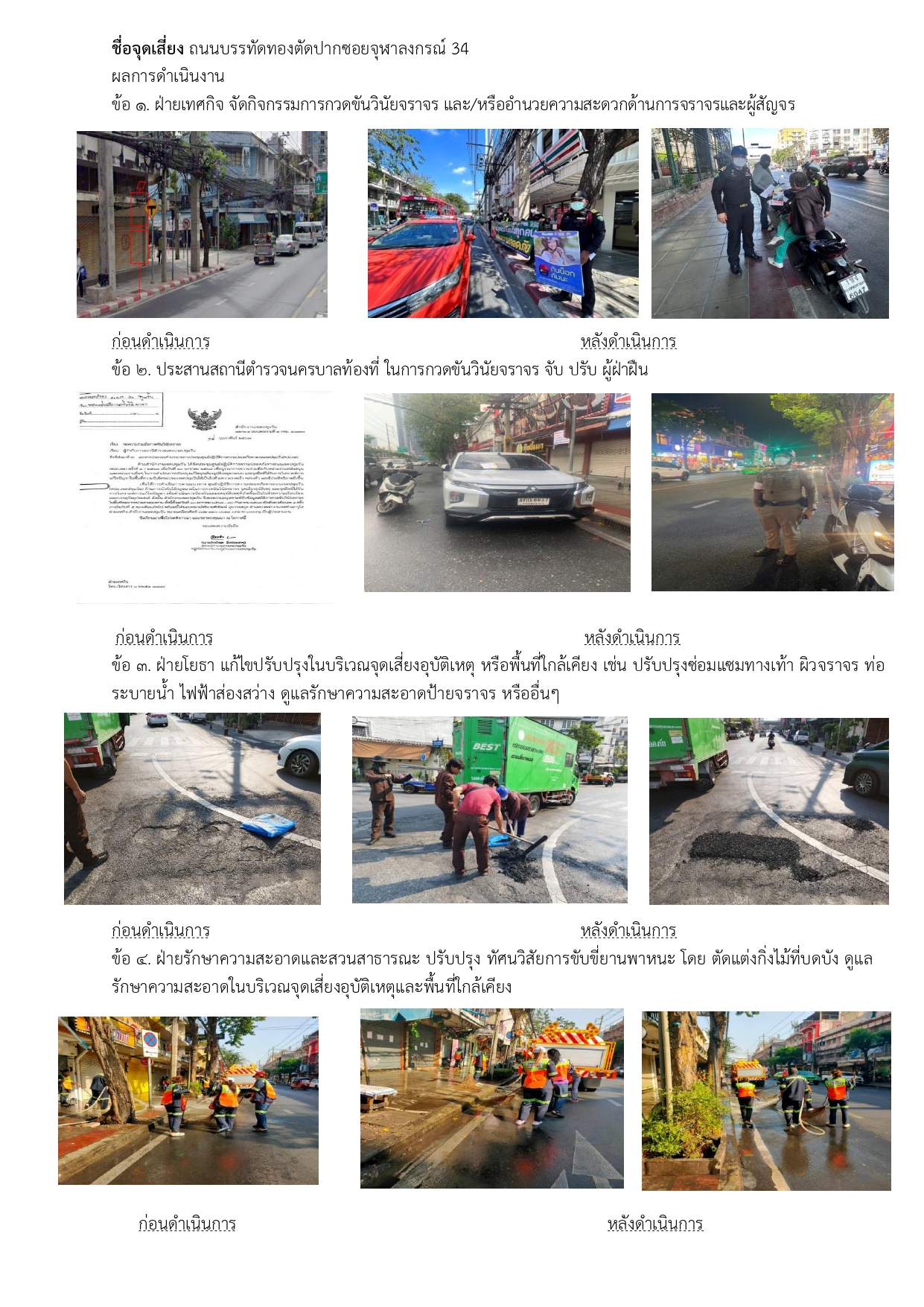![]() | 30-04-2024 | 1.00 | ![]() | จุดเสี่ยง ถนนบรรทัดทองตัดปากซอยจุฬาลงกรณ์ 34 1. ฝ่ายเทศกิจ จัดกิจกรรมการกวดขันวินัยจราจร และ/หรืออำนวยความสะดวกด้านการจราจรและผู้สัญจร 2. ประสานสถานีตำรวจนครบาลท้องที่ ในการกวดขันวินัยจราจร จับ ปรับ ผู้ฝ่าฝืน 3. ฝ่ายโยธา แก้ไขปรับปรุงในบริเวณจุดเสี่ยงอุบัติเหตุ หรือพื้นที่ใกล้เคียง เช่น ปรับปรุงซ่อมแซมทางเท้า ผิวจราจร ท่อระบายน้ำ ไฟฟ้าส่องสว่าง ดูแลรักษาความสะอาดป้ายจราจร หรืออื่นๆ 4. ฝ่ายรักษาความสะอาดและสวนสาธารณะ ปรับปรุง ทัศนวิสัยการขับขี่ยานพาหนะ โดย ตัดแต่งกิ่งไม้ที่บดบัง ดูแลรักษาความสะอาดในบริเวณจุดเสี่ยงอุบัติเหตุและพื้นที่ใกล้เคียง | |