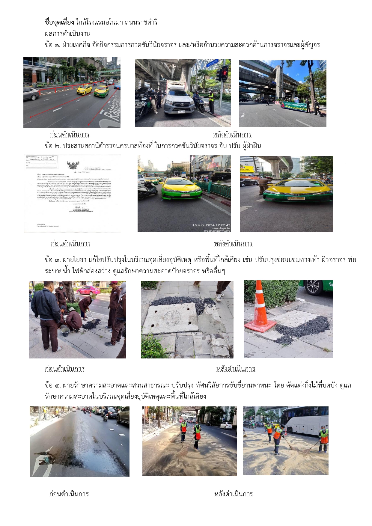 ![]() | 14-03-2024 | 1.00 | ![]() | จุดเสี่ยง ใกล้โรงแรมอโนมา ถนนราชดำริ 1. ฝ่ายเทศกิจ จัดกิจกรรมการกวดขันวินัยจราจร และ/หรืออำนวยความสะดวกด้านการจราจรและผู้สัญจร 2. ประสานสถานีตำรวจนครบาลท้องที่ ในการกวดขันวินัยจราจร จับ ปรับ ผู้ฝ่าฝืน 3. ฝ่ายโยธา แก้ไขปรับปรุงในบริเวณจุดเสี่ยงอุบัติเหตุ หรือพื้นที่ใกล้เคียง เช่น ปรับปรุงซ่อมแซมทางเท้า ผิวจราจร ท่อระบายน้ำ ไฟฟ้าส่องสว่าง ดูแลรักษาความสะอาดป้ายจราจร หรืออื่นๆ 4. ฝ่ายรักษาความสะอาดและสวนสาธารณะ ปรับปรุง ทัศนวิสัยการขับขี่ยานพาหนะ โดย ตัดแต่งกิ่งไม้ที่บดบัง ดูแลรักษาความสะอาดในบริเวณจุดเสี่ยงอุบัติเหตุและพื้นที่ใกล้เคียง | |