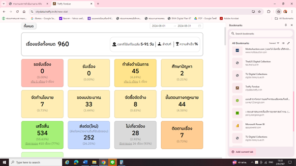 ![]() | 28-06-2024 | 87.23 | สถิติ Traffy Fondue สำนักงานเขตประเวศ เดือนพฤษภาคม -มิถุนายน 2567 จำนวนเรื่องแจ้งทั้งหมด 1,797 เรื่อง จำนวนเรื่องส่งต่อใหม่ 333 เรื่อง ไม่เกี่ยวข้อง 203เรื่อง (จำนวนเรื่องที่สำนักงานเขตดำเนินการเอง1,261 เรื่อง) ดำเนินการแล้วเสร็จ1,100 เรื่อง คิดเป็น ร้อยละ 87.23 กำลังดำเนินการ 2 เรื่อง ศึกษาปัญหา 17 เรื่อง จัดทำนโยบาย 6 เรื่อง ของบประมาณ 26เรื่อง จัดซื้อจัดจ้าง 17เรื่อง ขั้นตอนทางกฎหมาย 84 เรื่อง ติดตามเรื่อง 9 เรื่อง ความพึงพอใจ 3.96 | ||