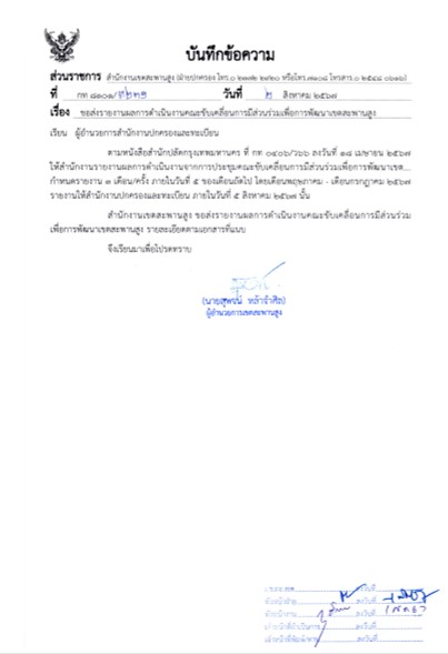 6 | สำนักงานเขตฯ รายงานผลการดำเนินงานของคณะขับเคลื่อนการมีส่วนร่วมเพื่อการพัฒนาเขต ดำเนินการ 3 เดือน/ครั้ง จำนวน 1 ฉบับ ให้สำนักงานปกครองและทะเบียน ภายในวันที่ 5 ของเดือนถัดไป | 20.00 | 01-08-2024 | 31-08-2024 |