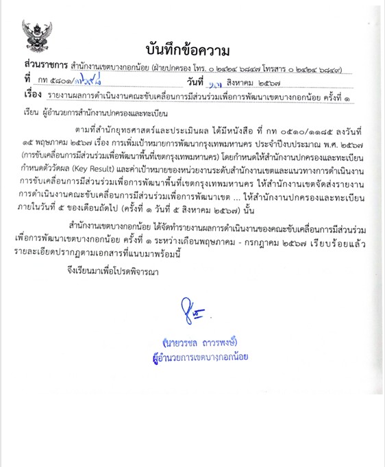 31-08-20241.00รายงานผลการดำเนินงานคณะขับเคลื่อนการมีส่วนร่วมเพื่อการพัฒนาเขตบางกอกน้อย ครั้งที่ 1 ใ้ห้สำนักงานปกครองและทะเบียนทราบ ตามหนังสือสำนักงานเขตบางกอกน้อย ที่ กท5801/3698 ลงวันที่ 13 สิงหาคม 2567
