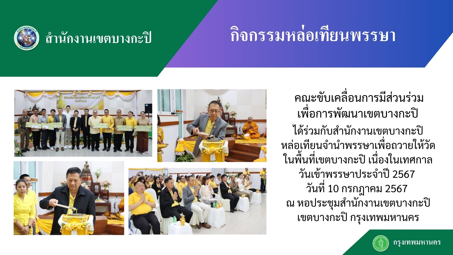15-07-20241.00คณะขับเคลื่อนการมีส่วนร่วมเพื่อการพัฒนาเขตบางกะปิได้ร่วมกับสำนักงานเขตบางกะปิหล่อเทียนจำนำพรรษาเพื่อถวายให้วัดในพื้นที่เขตบางกะปิ เนื่องในเทศกาลวันเข้าพรรษาประจำปี 2567 เมื่อวันที่ 10 ก.ค. 2567 ณ หอประชุมสำนักงานเขตบางกะปิ เขตบางกะปิ