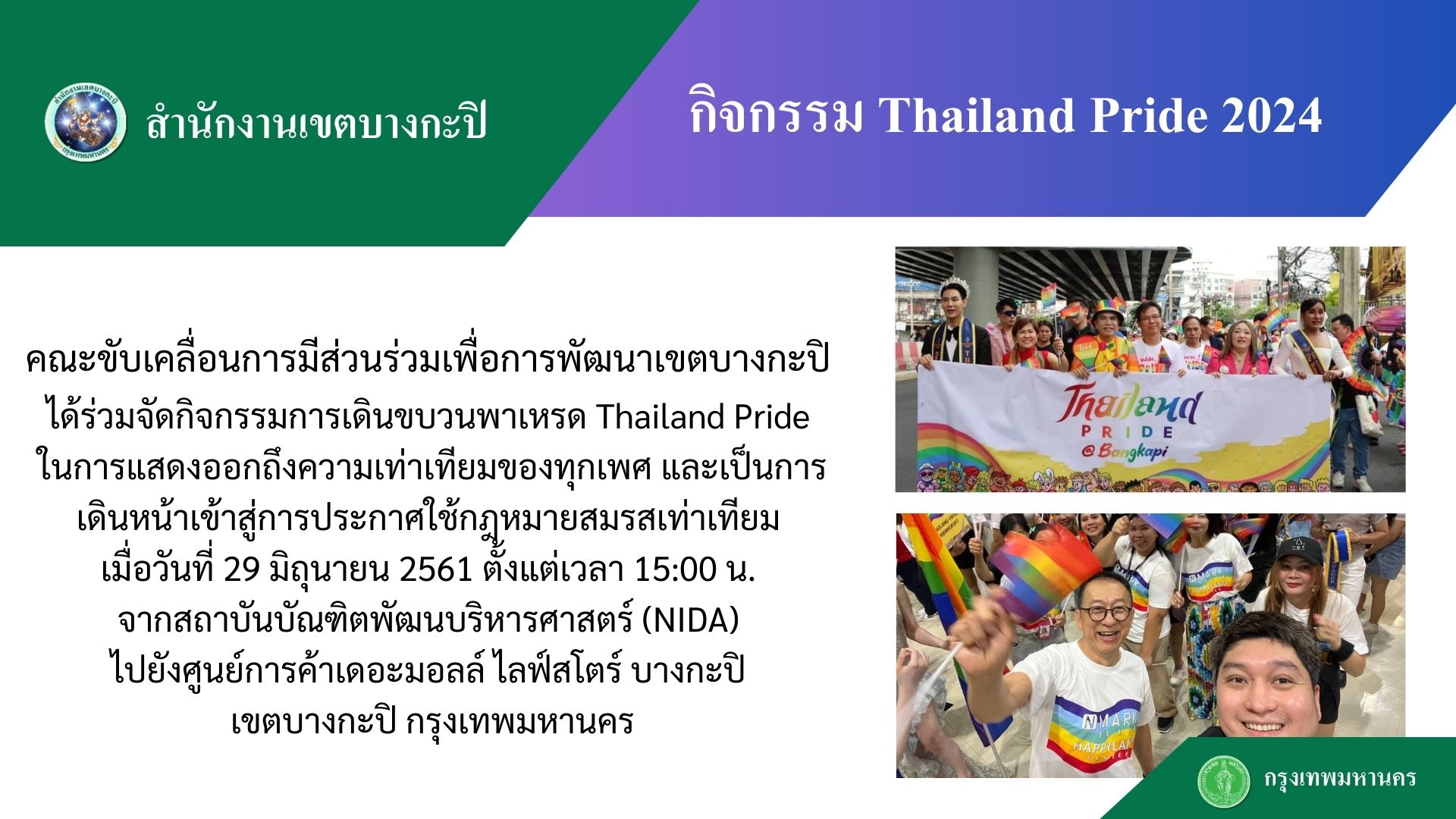 15-07-20241.00คณะขับเคลื่อนการมีส่วนร่วมเพื่อการพัฒนาเขตบางกะปิ ร่วมจัดกิจกรรมการเดินขบวนพาเหรด Thailand Pride ความเท่าเทียมทุกเพศ เดินหน้าเข้าสู่การประกาศใช้กฎหมายสมรสเท่าเทียม เมื่อวันที่ 29 มิถุนายน 2567 ตั้งแต่เวลา 15.00 น. จากนิด้าไปยังเดอะมอลล์ ไลฟ์สโตร์ บางกะปิ เขตบางกะปิ