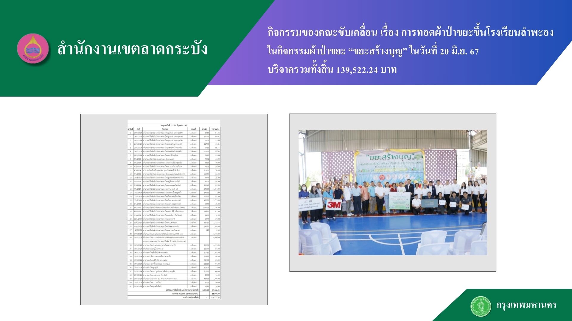 ![]() | 12-07-2024 | 0.00 | กิจกรรมของคณะขับเคลื่อน เรื่อง การทอดผ้าป่าขยะขึ้นโรงเรียนลำพะอง ในกิจกรรมผ้าป่าขยะ “ขยะสร้างบุญ” ในวันที่ 20 มิ.ย. 67 บริจาครวมทั้งสิ้น 139,522.24 บาท | ||