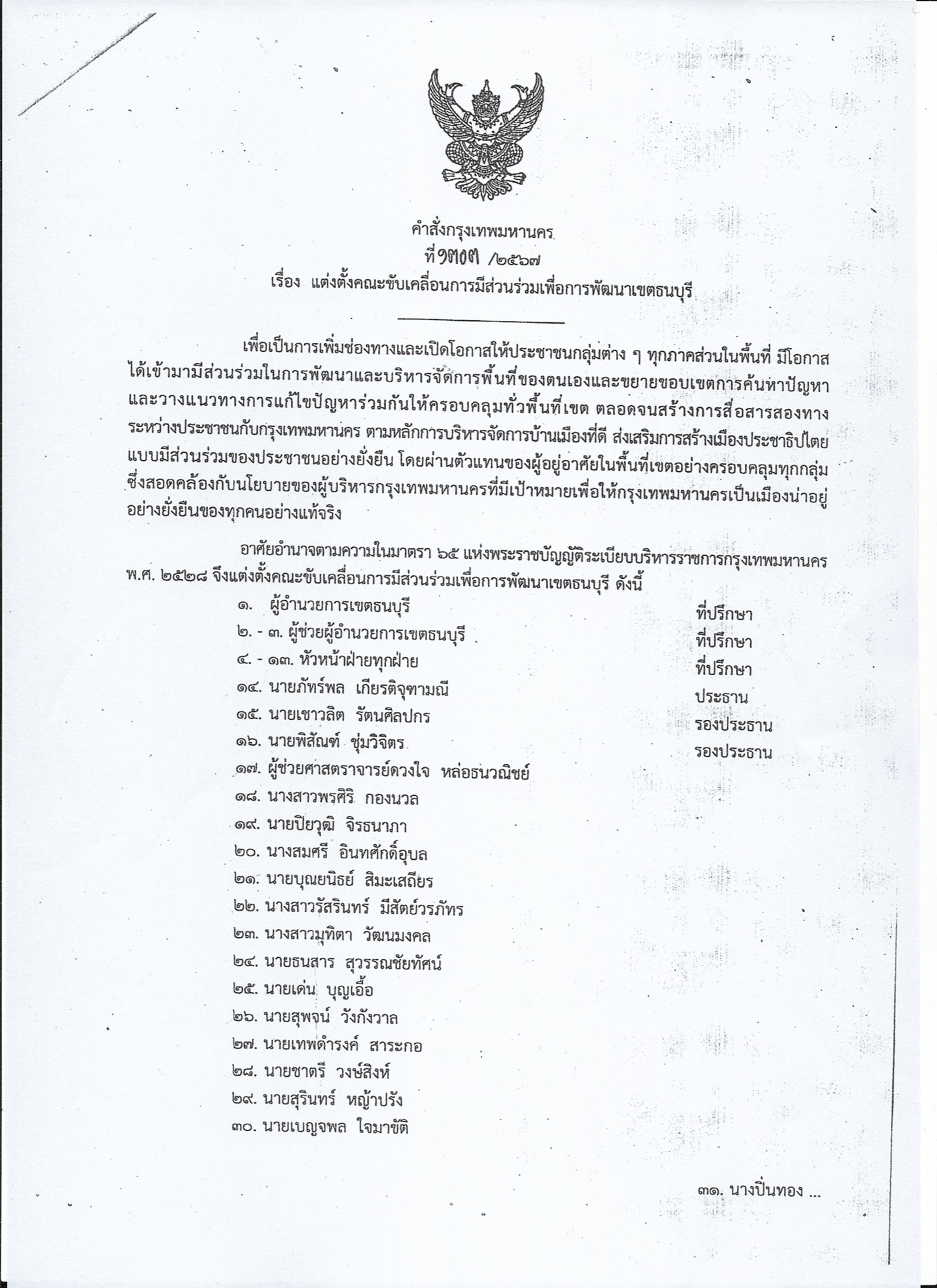 -จัดตั้งคณะขับเคลื่อนการมีส่วนร่วมเพื่อการพัฒนาเขตธนบุรี0.000.00สำนักงานเขตธนบุรีฝ่ายปกครอง