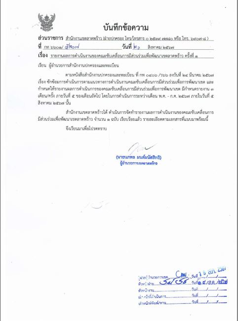 | 26-08-2024 | 1.00 |  | สำนักงานเขตลาดพร้าว รายงานผลการดำเนินงานของคณะขับเคลื่อนการมีส่วนร่วมเพื่อพัฒนาเขตลาดพร้าว จำนวน 1 ฉบับ | |