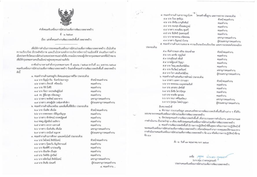 | 13-06-2024 | 1.00 |  | สำนักงานเขตลาดพร้าวได้เสนอคำสั่งฯ แต่งตั้งคณะขับเคลื่อนการมีส่วนร่วมเพื่อการพัฒนาเขตลาดพร้าว โดยได้ส่งให้สำนักงานปกครองและทะเบียนเมื่อวันที่ 19 เมษายน 2567 และปลัดกรุงเทพมหานครลงนามคำสั่งกรุงเทพมหานคร ที่ 1292/2567 ลงวันที่ 30 เมษายน 2567 | |