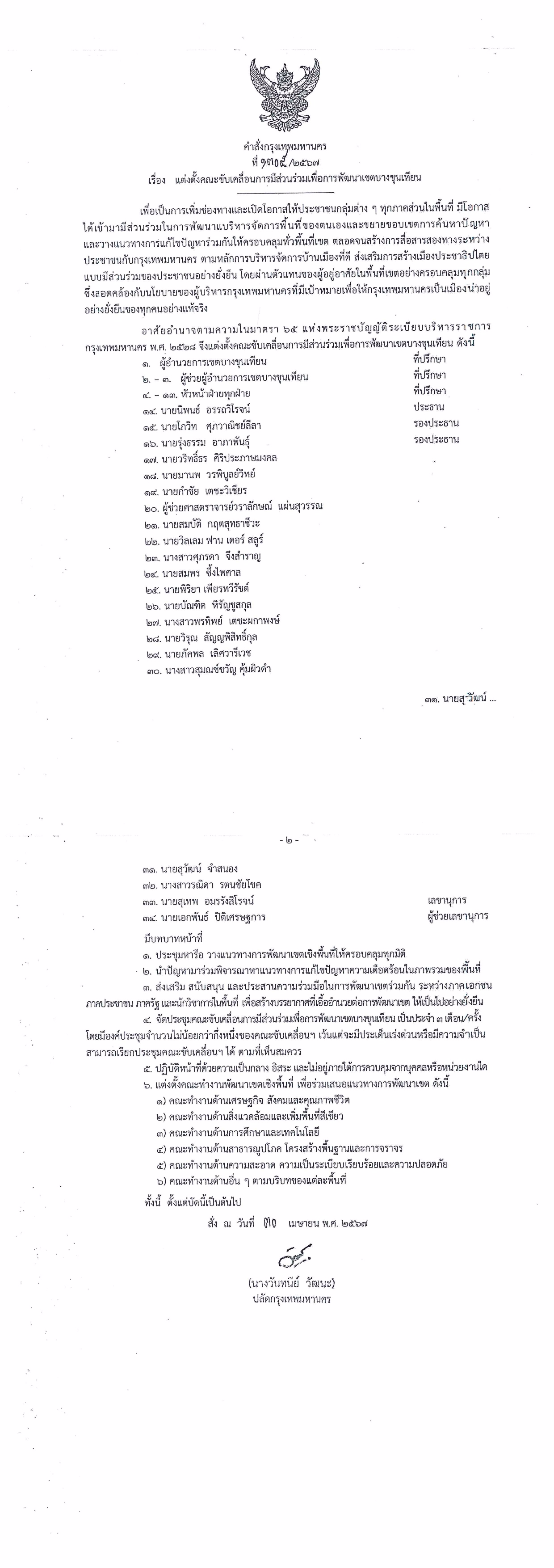 3 | เสนอคำสั่งแต่งตั้งคณะขับเคลื่อนฯ ให้สำนักงานปกครองและทะเบียน เพื่อเสนอปลัดกรุงเทพมหานครลงนามแต่งตั้ง | 20.00 | 01-03-2024 | 30-04-2024 |