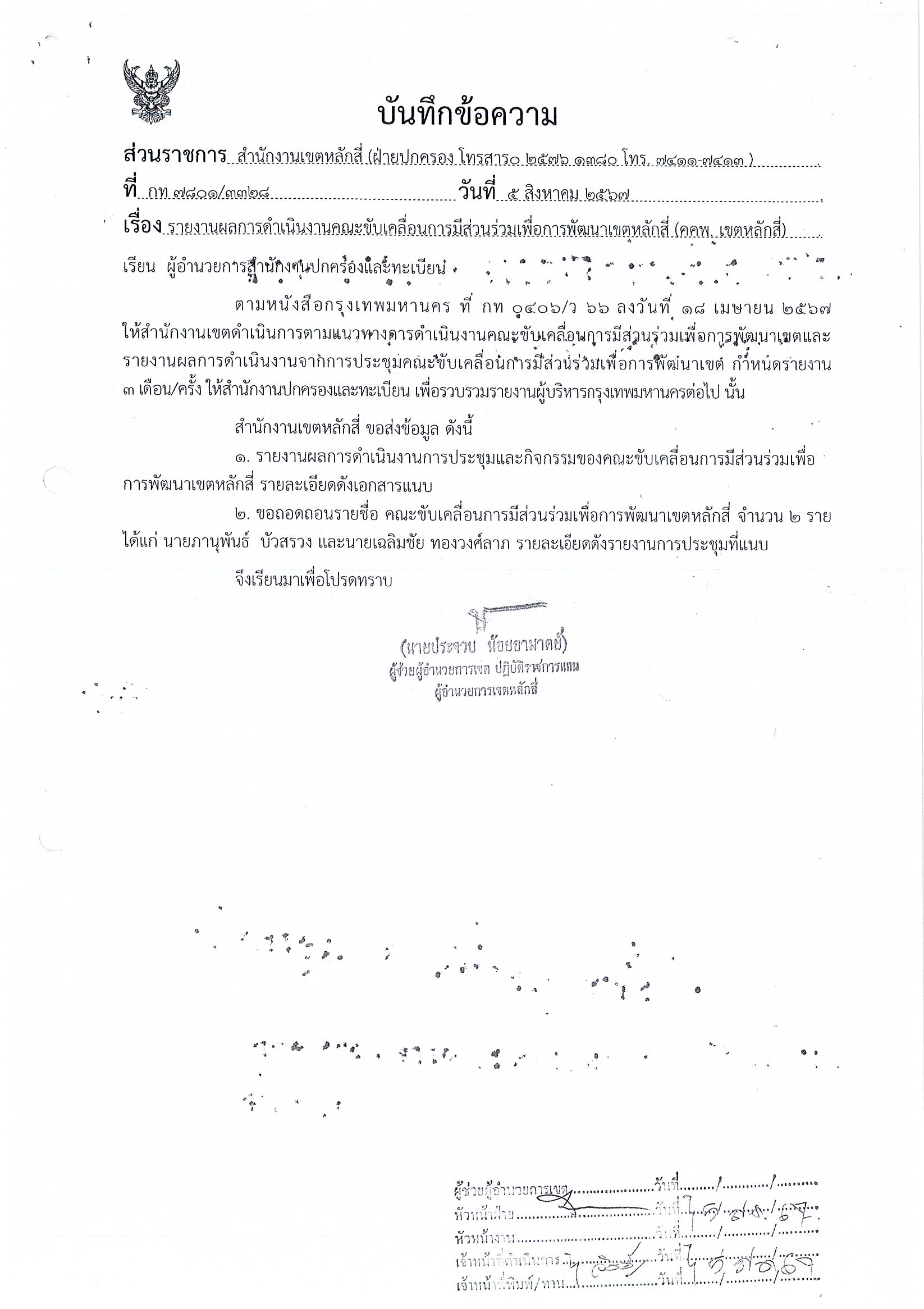 ![]() | 02-09-2024 | 1.00 | ![]() | ดำเนินการจัดทำรายงานผลการดำเนินงานคณะขับเคลื่อนการมีส่วนร่วมเพื่อการพัฒนาเขตหลักสี่ (คพพ.เขตหลักสี่) ให้สำนักงานปกครองและทะเบียน ตามหนังสือสำนักงานเขตหลักสี่ ที่ กท 7801/3328 ลงวันที่ 5 สิงหาคม 2567 | |