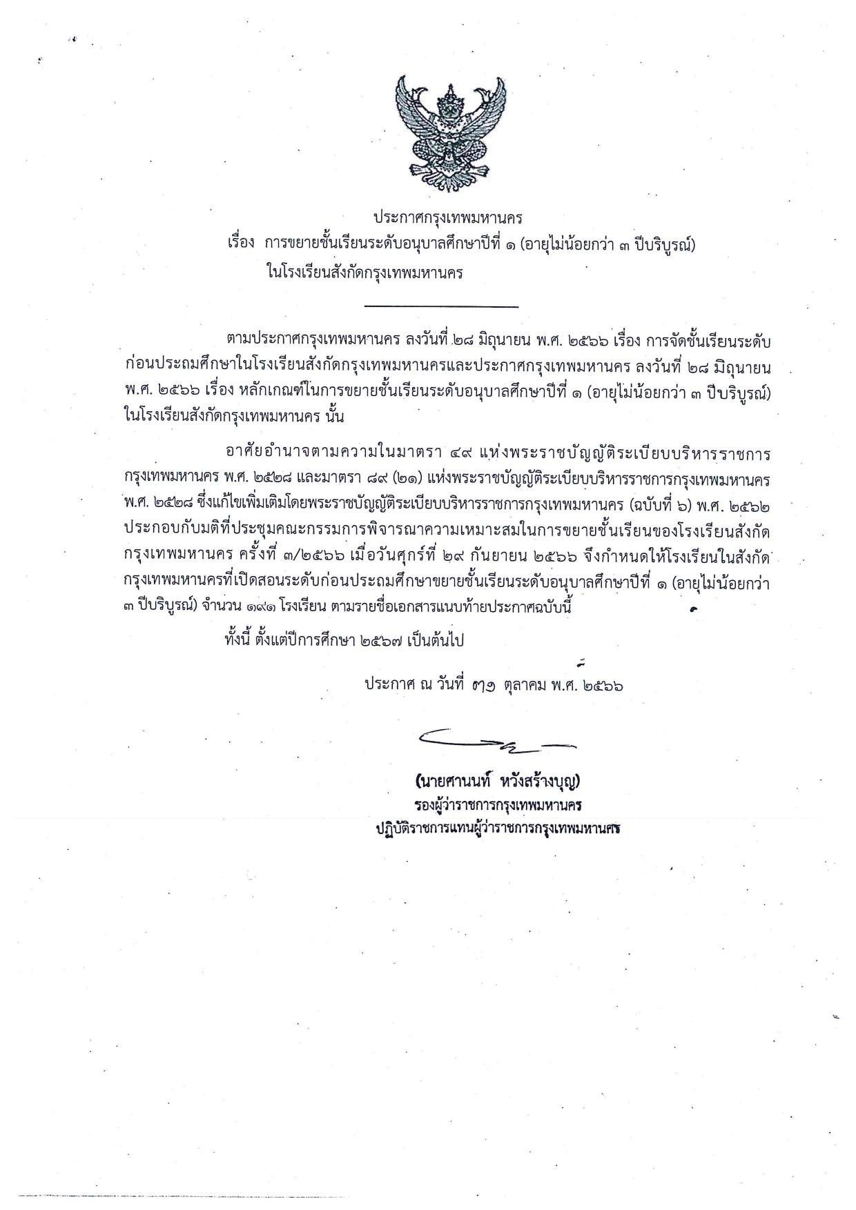 1เวียนแจ้งประกาศกรุงเทพมหานคร เรื่อง การจัดชั้นเรียนในโรงเรียนสังกัดกรุงเทพมหานคร ระดับก่อนประถมศึกษา และหลักเกณฑ์ในการขยายชั้นเรียนใน โรงเรียนสังกัดกรุงเทพมหานคร ระดับอนุบาลศึกษาปีที่ 1 (อายุไม่น้อยกว่า ๓ ปีบริบูรณ์)10.0001-06-202330-06-2023