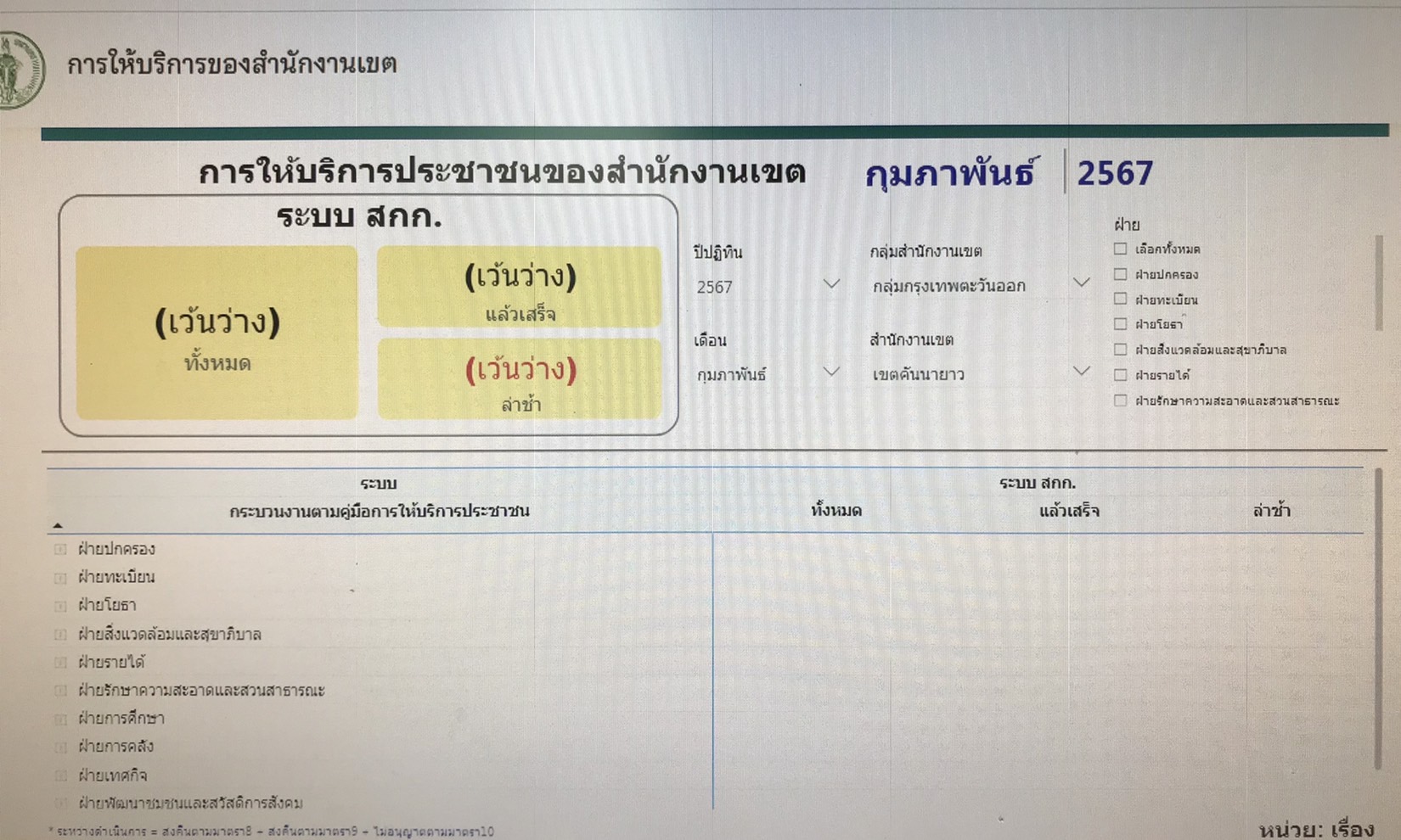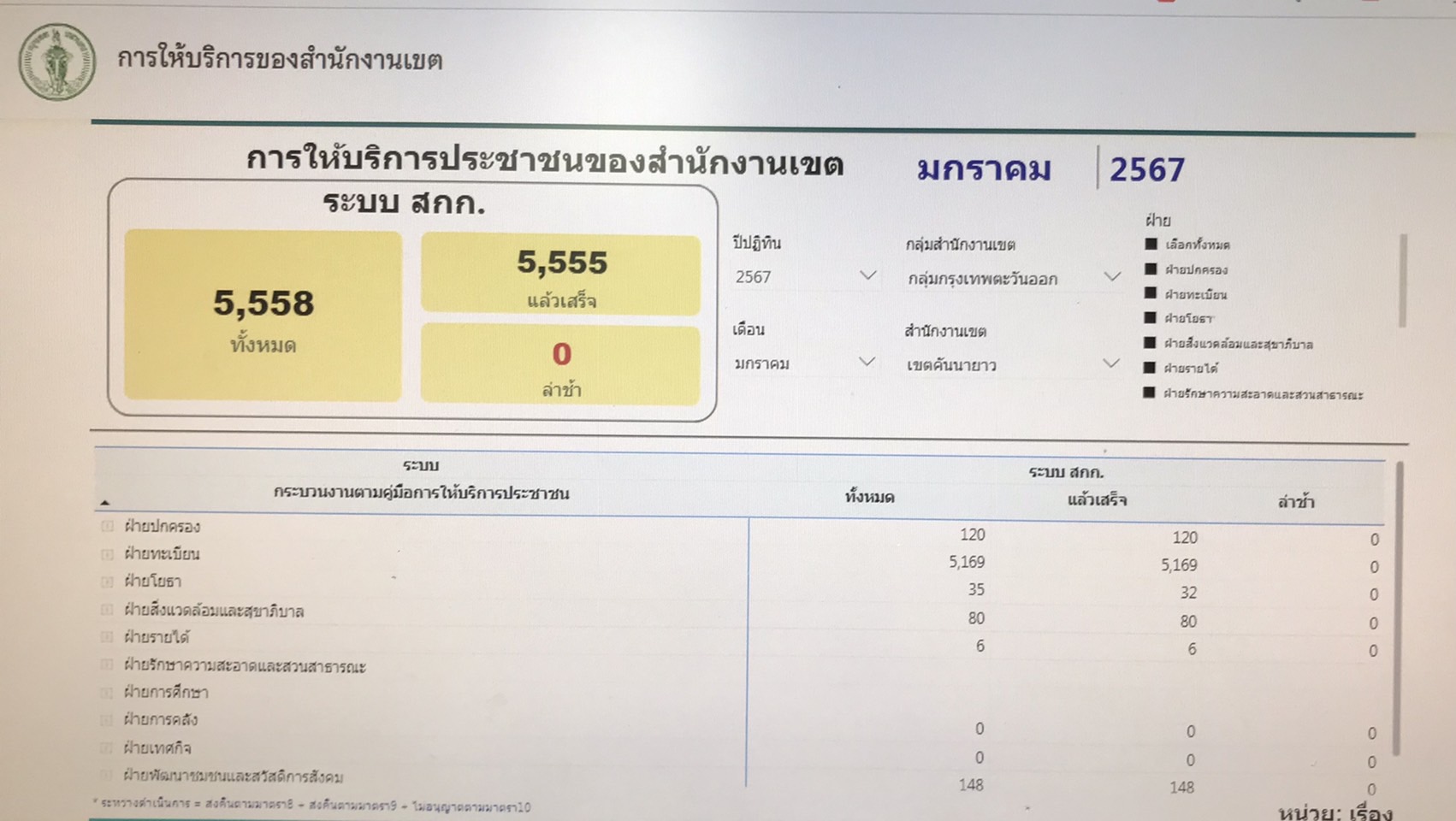 | 23-02-2024 | 100.00 |  | ประจำเดือนมกราคม จำนวนทั้งหมดรวม 8,128 เรื่อง จำนวนที่ดำเนินการแล้วเสร็จ 8,128 เรื่อง | |