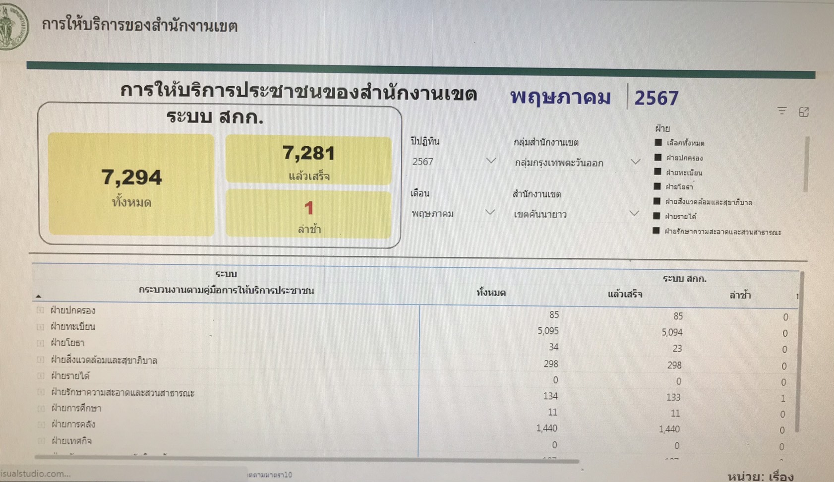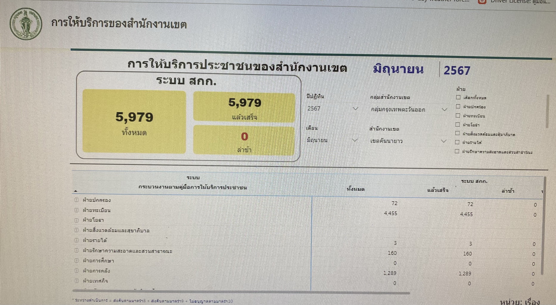 | 11-07-2024 | 100.00 |  | ประจำเดือนมิถุนายน จำนวนทั้งหมดรวม 5,979 เรื่อง จำนวนที่ดำเนินการแล้วเสร็จ 5,979 เรื่อง | |