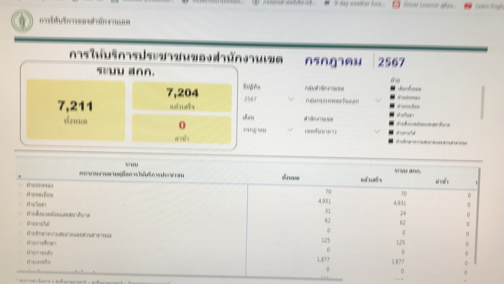| 21-08-2024 | 100.00 |  | ประจำเดือนกรกฎาคม จำนวนทั้งหมดรวม 7,211 เรื่อง จำนวนที่ดำเนินการแล้วเสร็จ 7,204 เรื่อง | |