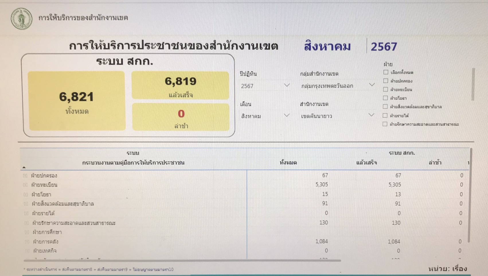 | 11-09-2024 | 100.00 |  | ประจำเดือนสิงหาคม จำนวนทั้งหมดรวม 6,821 เรื่อง จำนวนที่ดำเนินการแล้วเสร็จ 6,819 เรื่อง | |