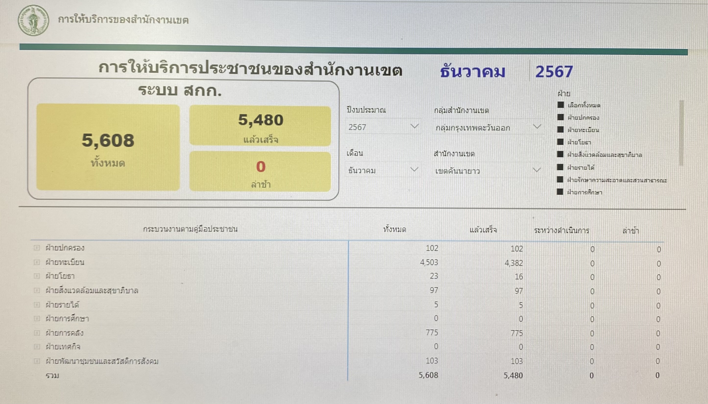 | 30-01-2024 | 100.00 |  | ประจำเดือนธันวาคม จำนวนทั้งหมดรวม 7,670 เรื่อง จำนวนที่ดำเนินการแล้วเสร็จ 7,670 เรื่อง | |