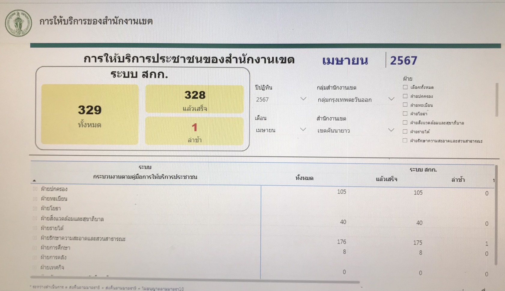 | 09-05-2024 | 100.00 |  | ประจำเดือนเมษายน จำนวนทั้งหมดรวม 329 เรื่อง จำนวนที่ดำเนินการแล้วเสร็จ 328 เรื่อง | |