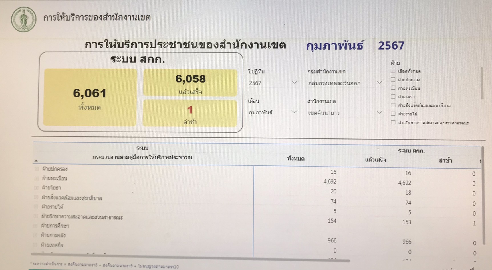 | 28-03-2024 | 100.00 |  | ประจำเดือนกุมภาพันธ์ จำนวนทั้งหมดรวม 6,061 เรื่อง จำนวนที่ดำเนินการแล้วเสร็จ 6,058 เรื่อง | |