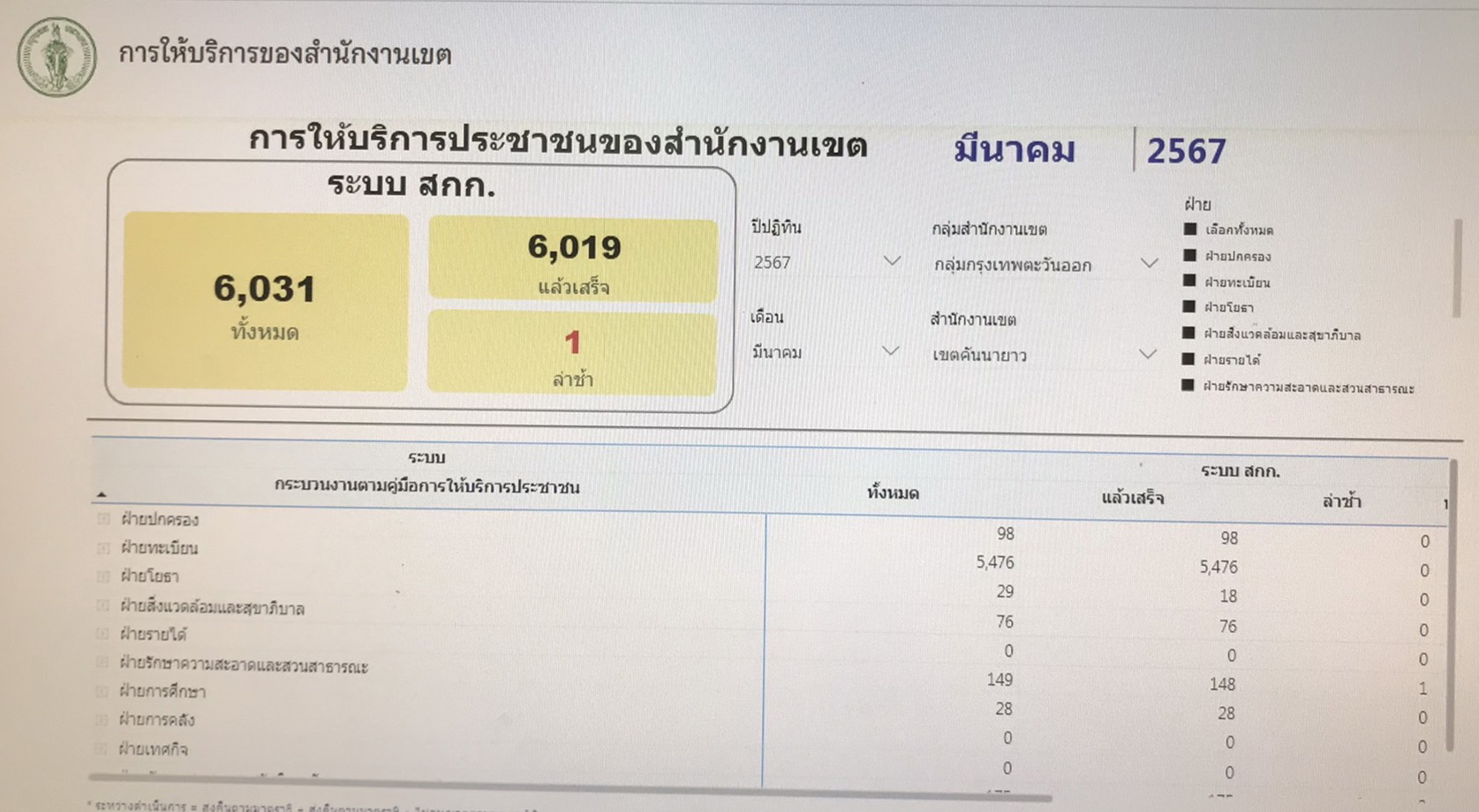 | 19-04-2024 | 100.00 |  | ประจำเดือนมีนาคม จำนวนทั้งหมดรวม 6,031 เรื่อง จำนวนที่ดำเนินการแล้วเสร็จ 6,019 เรื่อง | |