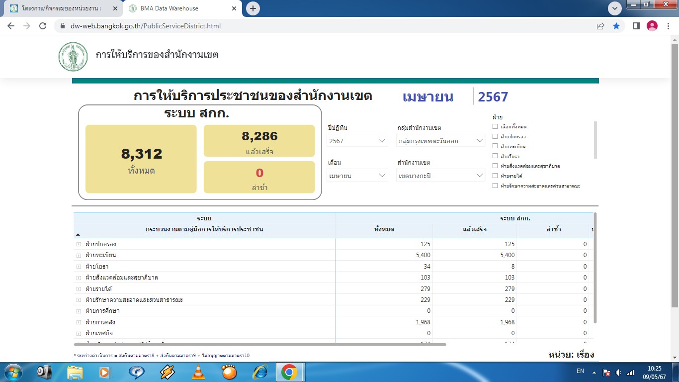 | 09-05-2024 | 100.00 |  | เดือนเมษายน 2567 จำนวนเรื่องทั้งหมด 8,312 จำนวนเรื่องที่ดำเนินการแล้วเสร็จ 8,286 | |