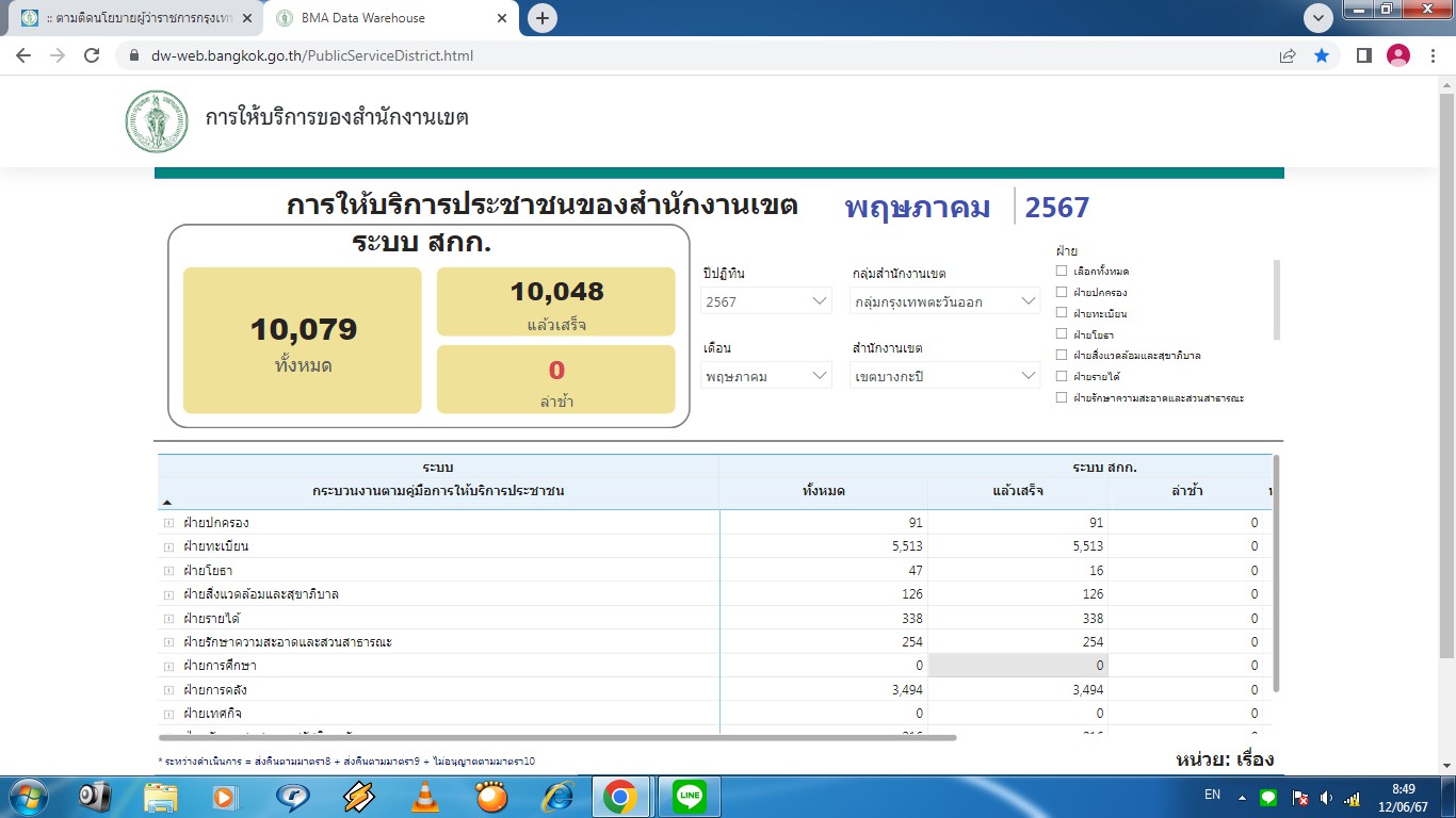 | 10-06-2024 | 100.00 |  | เดือนพฤษภาคม 2567 จำนวนเรื่องทั้งหมด 10,079 จำนวนเรื่องที่ดำเนินการแล้วเสร็จ 10,048 | |
