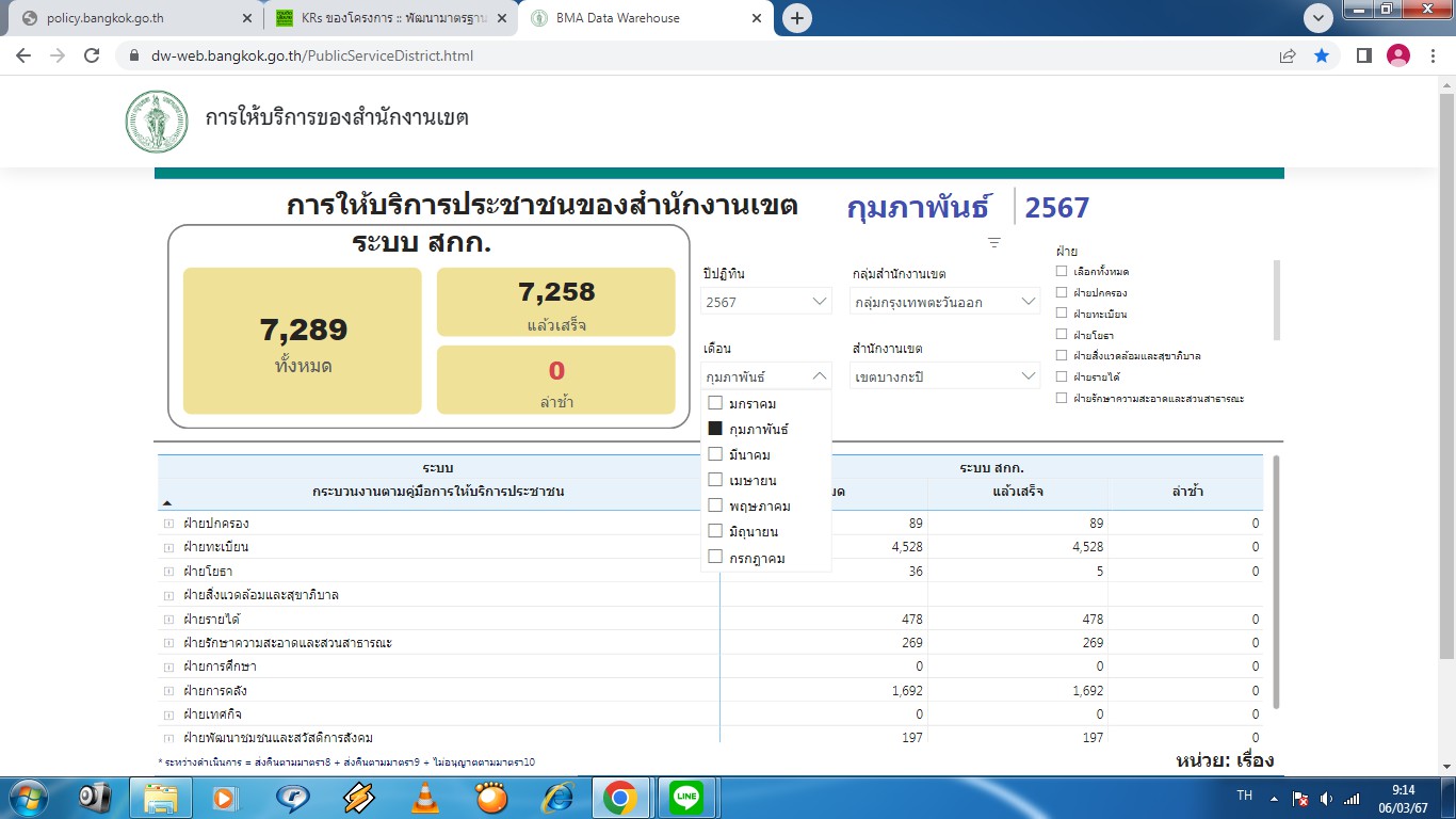| 05-03-2024 | 100.00 |  | เดือนกุมภาพันธ์ 2567 จำนวนเรื่องทั้งหมด 7,289 จำนวนเรื่องที่ดำเนินการแล้วเสร็จ 7,258 | |