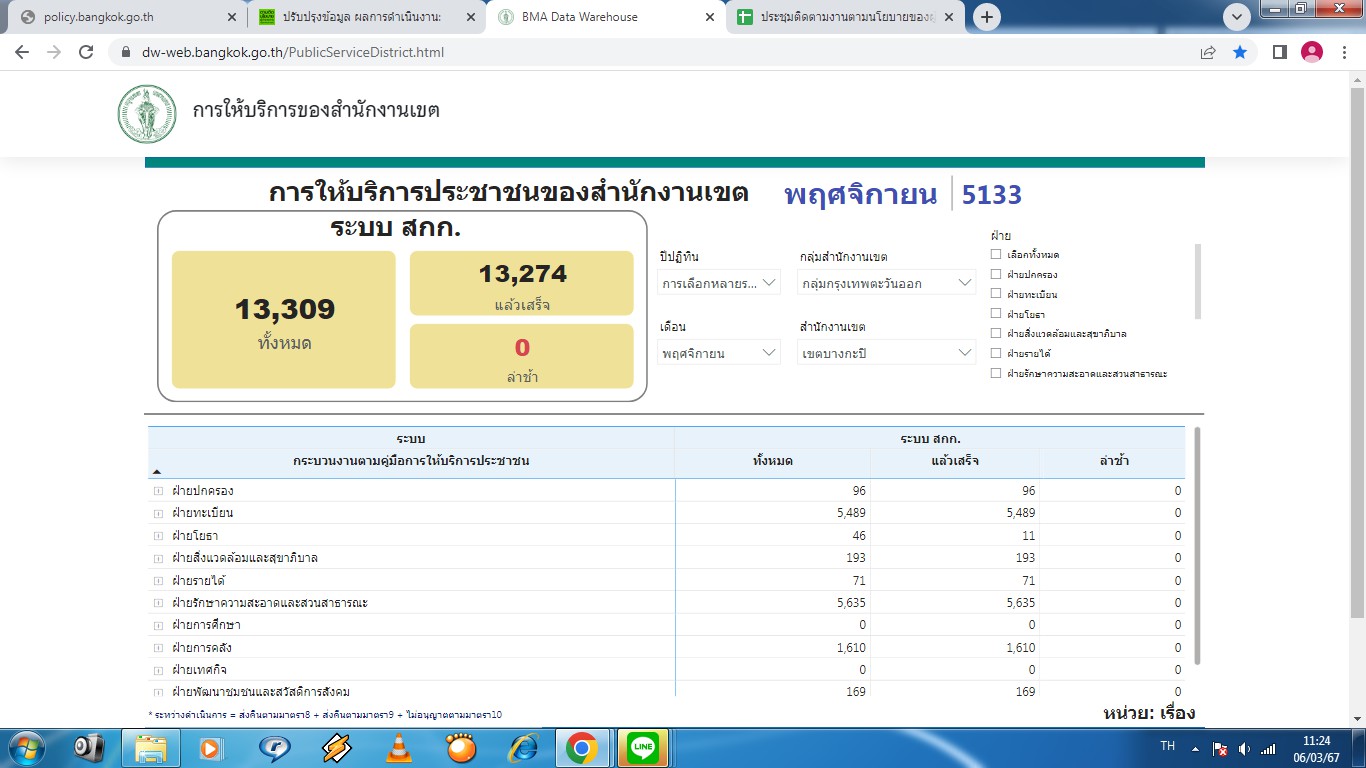 | 30-11-2023 | 100.00 |  | เดือนพฤศจิกายน 2566 จำนวนเรื่องทั้งหมด 13,309 จำนวนเรื่องที่ดำเนินการแล้วเสร็จ 13,274 | |