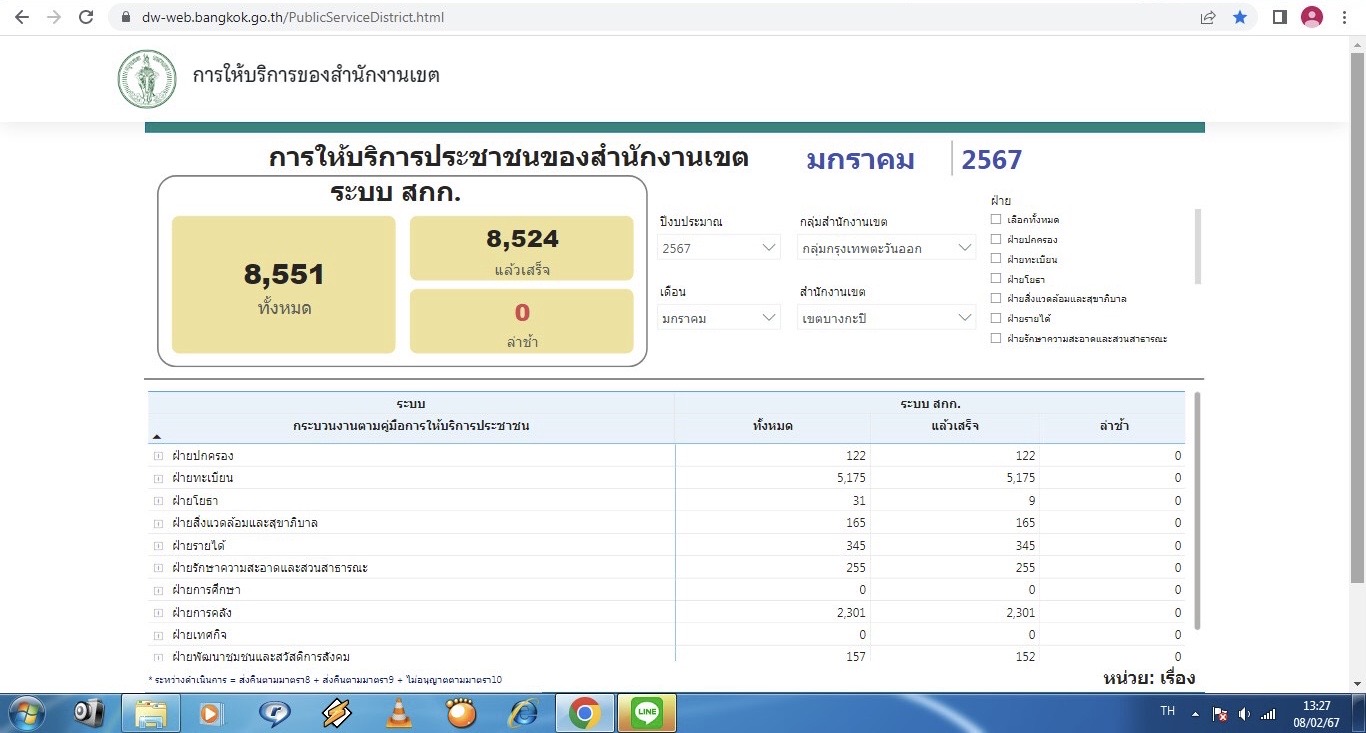 | 08-02-2024 | 100.00 |  | เดือนมกราคม 2567 จำนวนเรื่องทั้งหมด 8,551 จำนวนเรื่องที่ดำเนินการแล้วเสร็จ 8,524 | |
