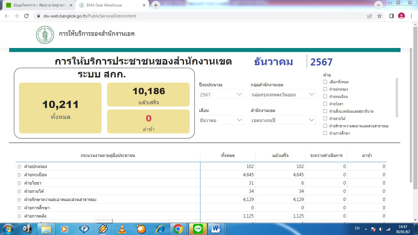 | 09-01-2024 | 100.00 |  | เดือนธันวาคม 2566 จำนวนเรื่องทั้งหมด 10,211 จำนวนเรื่องที่ดำเนินการแล้วเสร็จ 10,186 | |