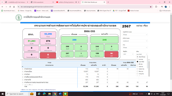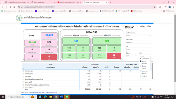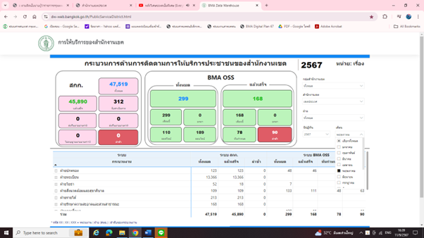 ![]() | 31-05-2024 | 100.00 | ![]() | ข้อมูลเดือนพฤษภาคม 2567 จำนวนคำขอรับบริการ 47,519 คำขอ จำนวนคำขอล่าช้า 0 คำขอ คิดเป็นจำนวนคำขอที่เขตสามารถให้บริการได้ภายในกรอบเวลาตามคู่มือประชาชนร้อยละ 100 ข้อมูลจาก https://dw-web.bangkok.go.th/PublicServiceDistrict.html | |