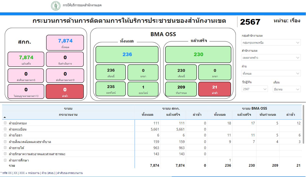 | 03-05-2024 | 100.00 |  | เดือนมีนาคม 2567 คำขอทั้งหมด 7,874 เรื่อง คำขอที่เขตสามารถให้บริการได้ภายในกรอบเวลาตามคู่มือประชาชน 7,874 เรื่อง คิดเป็นร้อยละ 100 | |