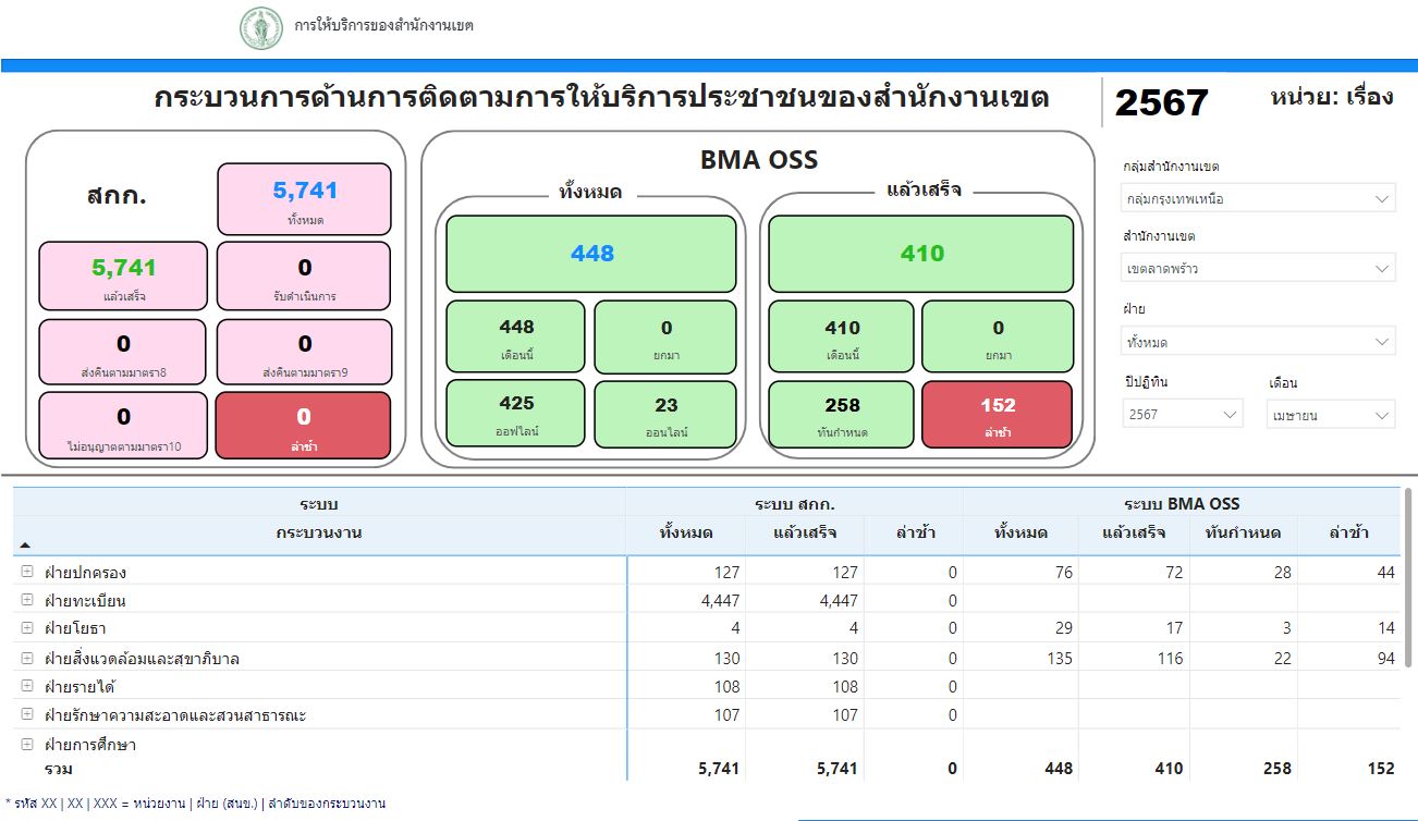 | 05-06-2024 | 100.00 |  | เดือนพฤษภาคม 2567 คำขอทั้งหมด 7,981 เรื่อง คำขอที่เขตสามารถให้บริการได้ภายในกรอบเวลาตามคู่มือประชาชน 7,981 เรื่อง คิดเป็นร้อยละ 100 | |
