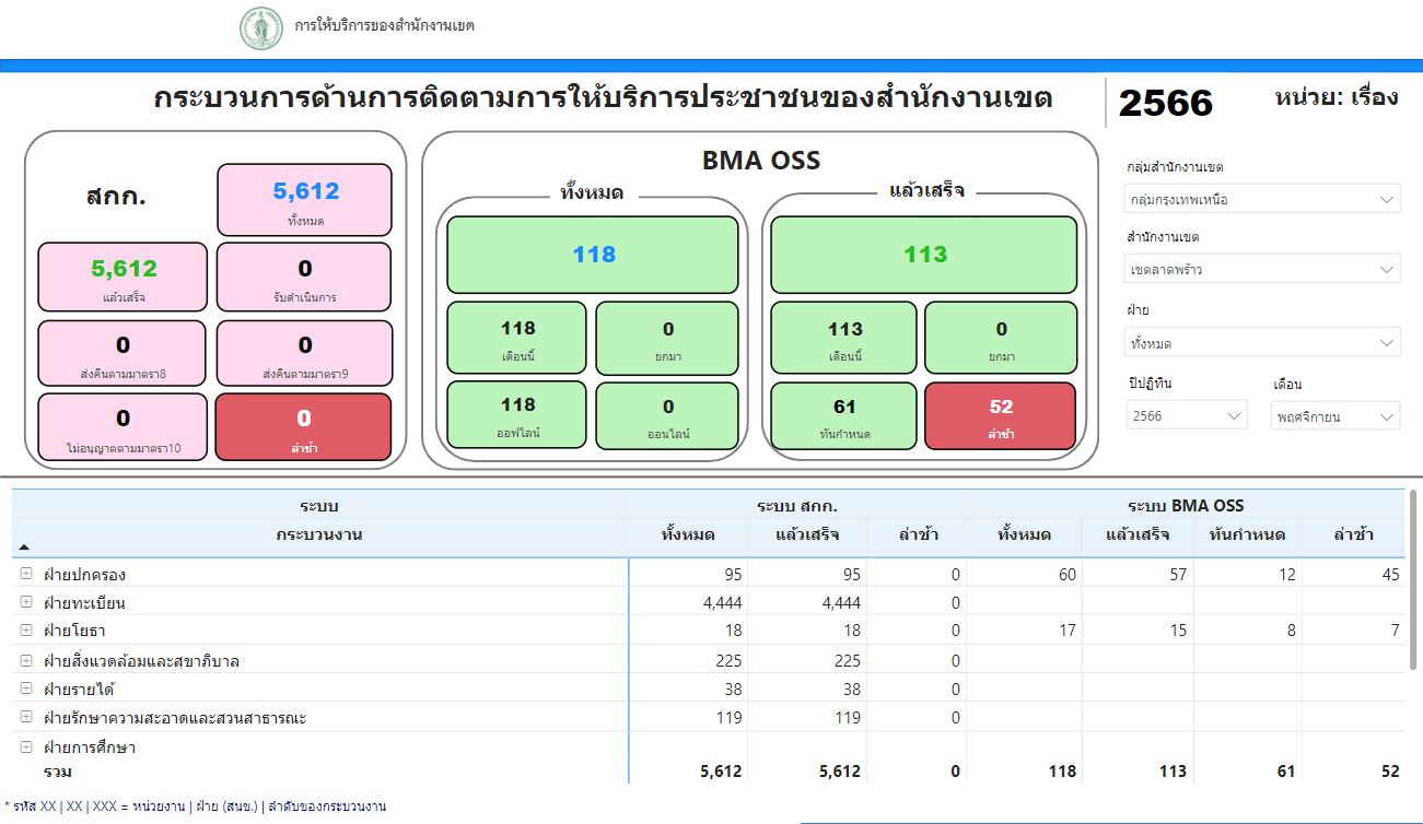 | 27-11-2023 | 100.00 |  | เดือนพฤศจิกายน 2566 คำขอทั้งหมด 5,612 เรื่อง คำขอที่เขตสามารถให้บริการได้ภายในกรอบเวลาตามคู่มือประชาชน 5,612 เรื่อง คิดเป็นร้อยละ 100 | |