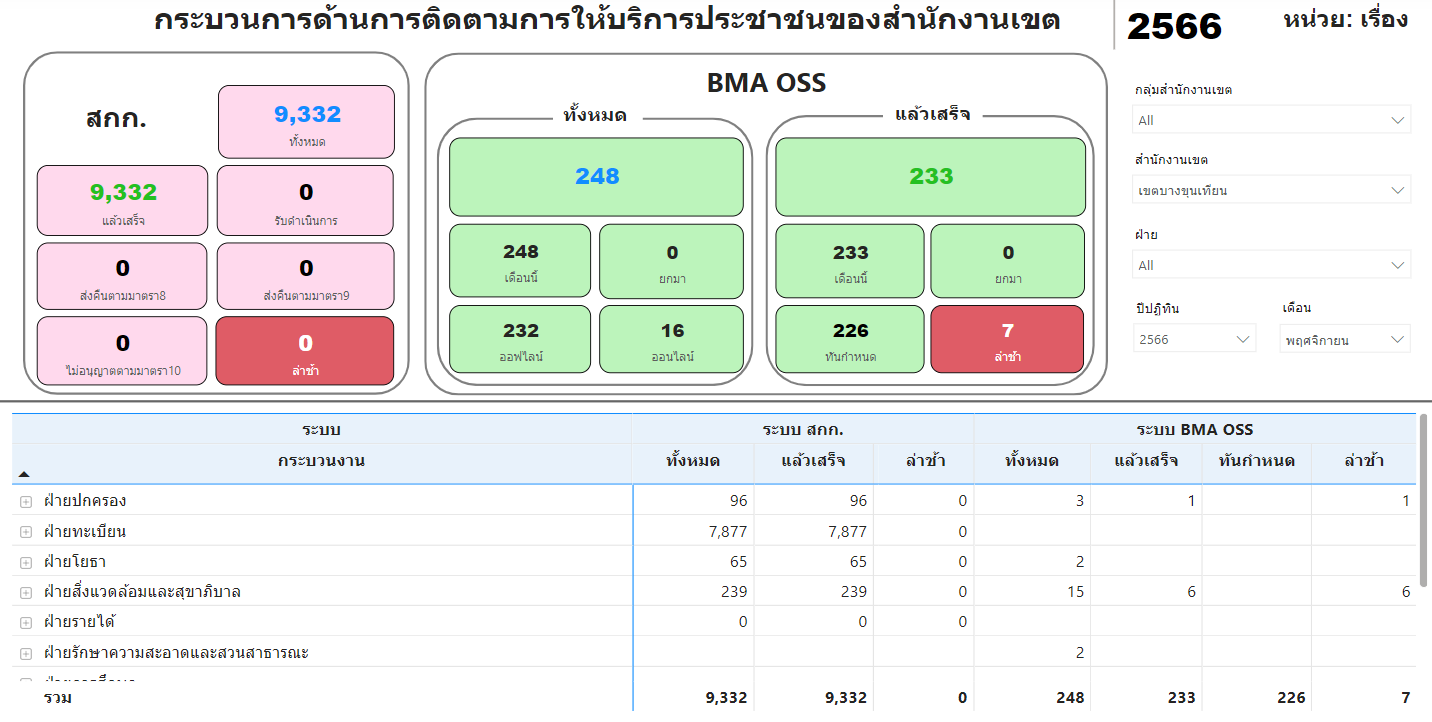 1 | แจ้งแนวทางดำเนินการและมอบหมายให้ทุกฝ่ายรายงานผลความสำเร็จในการให้บริการภายในกรอบระยะเวลาตามคู่มือให้ฝ่ายปกครองทุกเดือน | 5.00 | 01-10-2023 | 30-11-2023 |