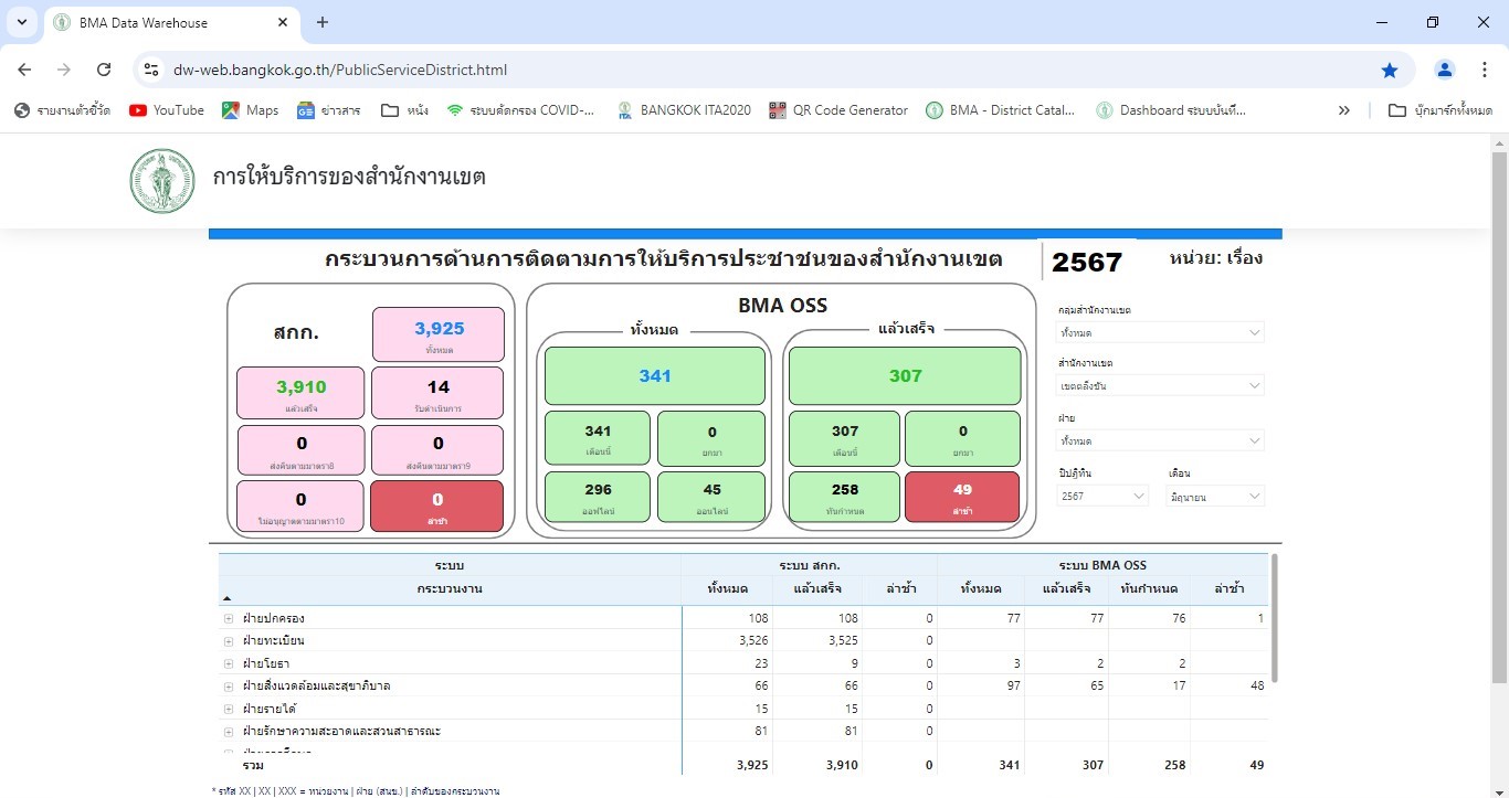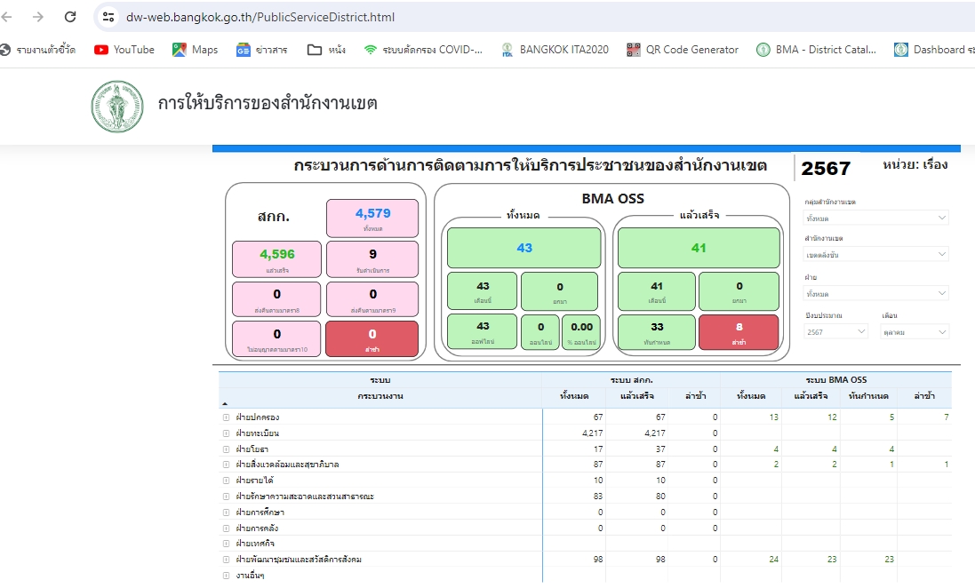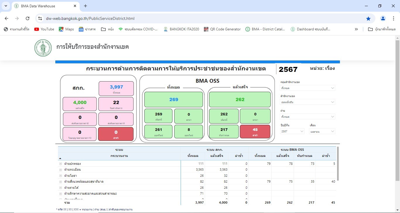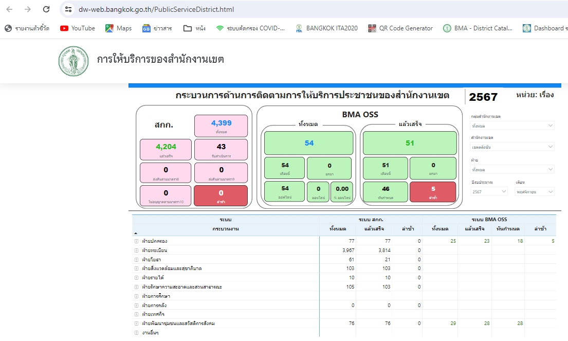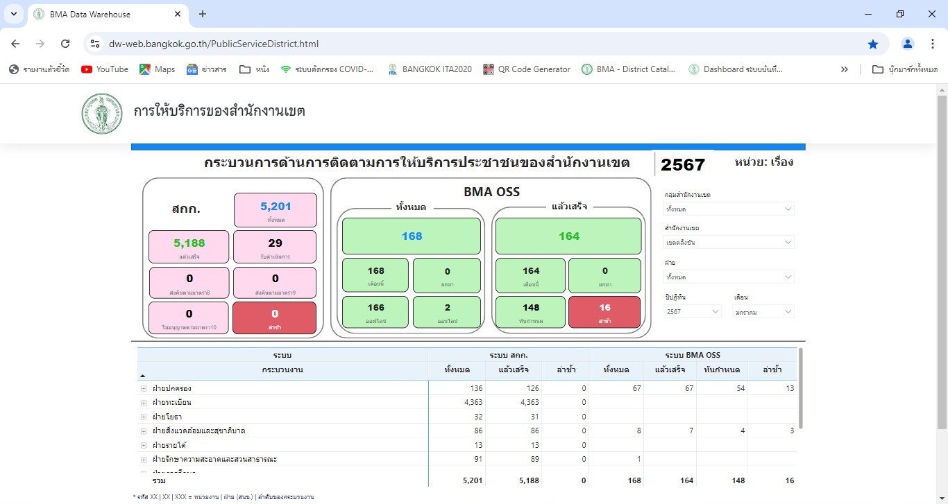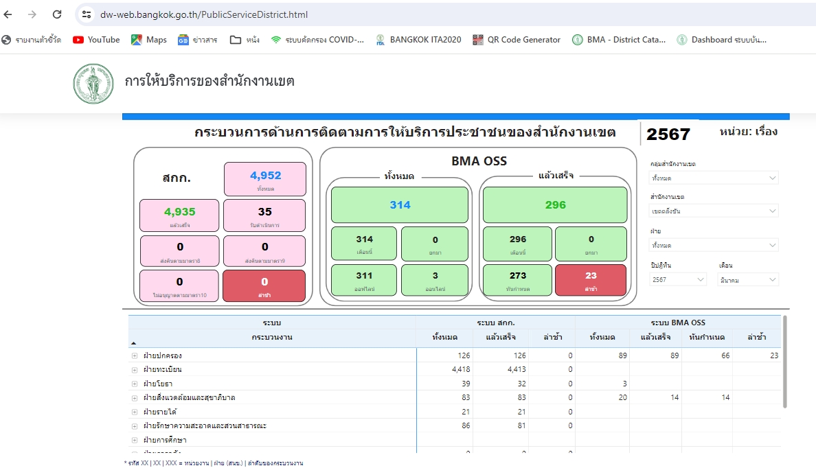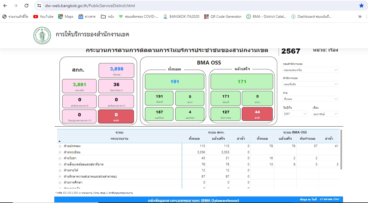 ![]() | 13-09-2024 | 99.70 | ![]() | เดือนกันยายน 2567 จำนวนคำขอทั้งหมด 4,330 เรื่อง จำนวนเรื่องที่ล่าช้า 13 เรื่อง (ร้อยละ 99.7) สรุปผล 1 ตุลาคม 2566 – 30 กันยายน 2567 1. คำขอรับบริการจากประชาชนที่มายื่นขอรับบริการ ณ สำนักงานเขต จำนวน 52,949 คำขอ โดยสำนักงานเขตสามารถให้บริการได้ภายในกรอบเวลาตามคู่มือประชาชน จำนวน 52,949 คำขอ 2. คำขอผ่านช่องทางระบบศูนย์รับคำขออนุญาตของกรุงเทพมหานคร (BMA OSS) จำนวน 2,163 คำขอ โดยสำนักงานเขตสามารถให้บริการได้ภายในกรอบเวลาตามคู่มือประชาชน จำนวน 1,830 คำขอ รวมคำขอรับบริการทั้งหมดจำนวน 55,112 คำขอ โดยสำนักงานเขตสามารถให้บริการได้ภายในกรอบเวลาตามคู่มือประชาชน จำนวนทั้งหมด 54,779 คำขอ คิดเป็น ร้อยละ 99.4 (คำขอล่าช้าทั้งหมดจำนวน 333 คำขอ) |