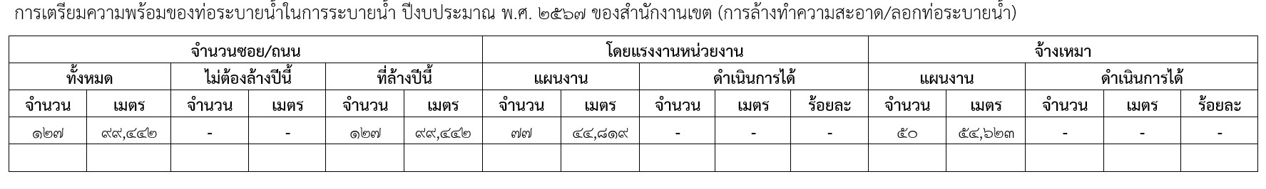16-05-20240.00ผลการดำเนินการล้างทำความสะอาดท่อระบายน้ำ ประจำเดือนพฤษภาคม 2567 ดำเนินการตามเเผน 50 ซอย ความยาว 54,623 เมตร เเต่เนื่องจากมีการปรับปรุงถนนจำนวน 2 ซอย คือ ซอยอ่อนนุช 66 (โมราวรรณ 2) เเละซอยอ่อนนุช 39 (ซอยอนามัย) ทำให้ไม่ต้องดำเนินการในส่วนนี้ ดังนั้น ผลดำเนินการเเล้วเสร็จ จำนวน 48 ซอย ความยาว 52,573 เมตร คิดเป็นร้อยละ 100